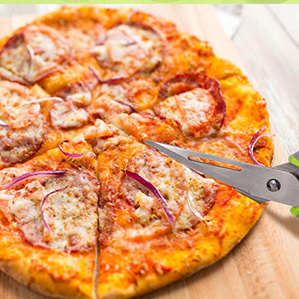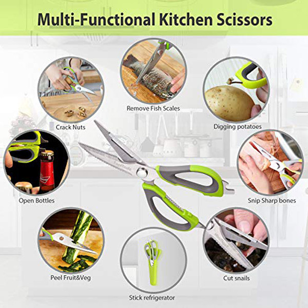 قیچی 8 کاره آشپزخانه یک قیچی منحصر به فرد است که با طراحی فوق العاده هوشمندانه ای که دارد می تواند چندین کار سنگین را با هم انجام دهد. در نگاه اول این محصول یک قیچی با تیغه های بسیار تیز میباشد که میتوان از آن برای برش نان, میوه و سبزیجات و حتی مرغ و گوشت استفاده کرد اما پس از جدا کردن 2 تیغه ی این محصول از یکدیگر از کارایی بسیار بالای آن شگفت زده خواهید شد.اولین کاربرد هریک از تیغه ها استفاده به عنوان چاقویی بسیار تیز و کاربردی میباشد. در انتهای یکی از دسته های این قیچی قطعه ای فلزی قرار داده شده که میتوان از آن به عنوان درب باز کن , پیچ گوشتی 2 سو , لگه گیر سیب زمینی و حتی برای ایجاد سوراخ بر روی پوسته ی آهکی تخم مرغ استفاده کرد. از دیگر کاربردهای این قیچی میتوان به وجود پوست کن تیز بر روی یکی از تیغه ها اشاره کرد. ازویژگی های بسیار کاربردی این محصول تبدیل شدن یکی از تیغه ها به فلس گیر ماهی است که با چندحرکت به راحتی میتوان این کار را انجام داد.اما مهم ترین ویژگی این محصول که سبب تمایز آن با کالاهای مشابه میگردد خاصیت مگنتی این قیچی میباشد که به واسطه ی آن میتوانید قیچی را بر روی سطوح مختلف مانند یخچال نصب کرده و به این ترتیب قیچی بدون خطر برای فرزندانتان در دسترس شما باشد.
