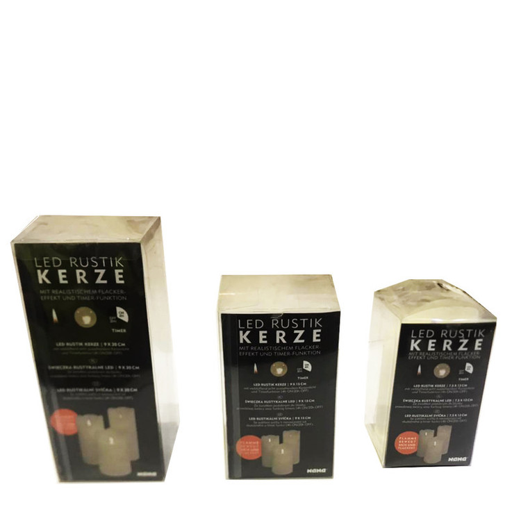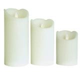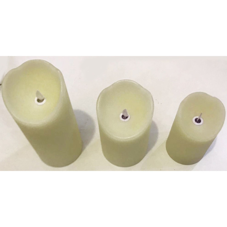 شمع استوانه ای LED مجموعه سه عددی با قطر 5 سانتی متر که ارتفاع شمع بزرگ11، شمع متوسط9 و شمع کوچک7سانتی متر است. نور ال ای دی موجود در شمع به آرامی کم نور و پر نور می شود و مانند یک شمع واقعی حس واقعی را ایجاد کند. این شمع باتری خور بوده (از نوع ساعتی) و می توان از آن درون یا بیرون منزل در ایوان یا بالکن استفاده کرد. استفاده از آن بسیار آسان است، شمعی است که همیشه می تواند روشن بماند و مصرف نشود! بی خطر و بدون بود بوده و در جعبه 3باتری نیز موجود است.