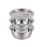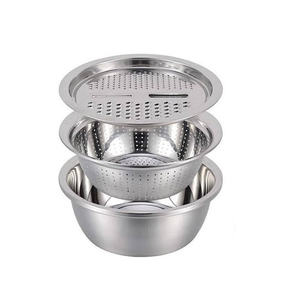 این ست چندکاره شامل یک عدد لگن، آبکش و رنده چندکاره و با تیغه های مختلف می باشد. جنس این کالا از استیل ضد زنگ می باشد. قطر دایره این ست 30سانتی متر است و با طراحی خلاقانه ای که دارد کم ترین فضا را اشغال می کند با توجه به اینکه امکان قرار گیری آبکش درون لگن وجود دارد و شما می توانید در مواقعی که از این وسیله استفاده نمی کنید آبکش و رنده را درون لگن بگذارید و در گوشه ای قراردهید. رنده به عنوان درب لگن و آبکش بر روی آنها قرار می گیرد.