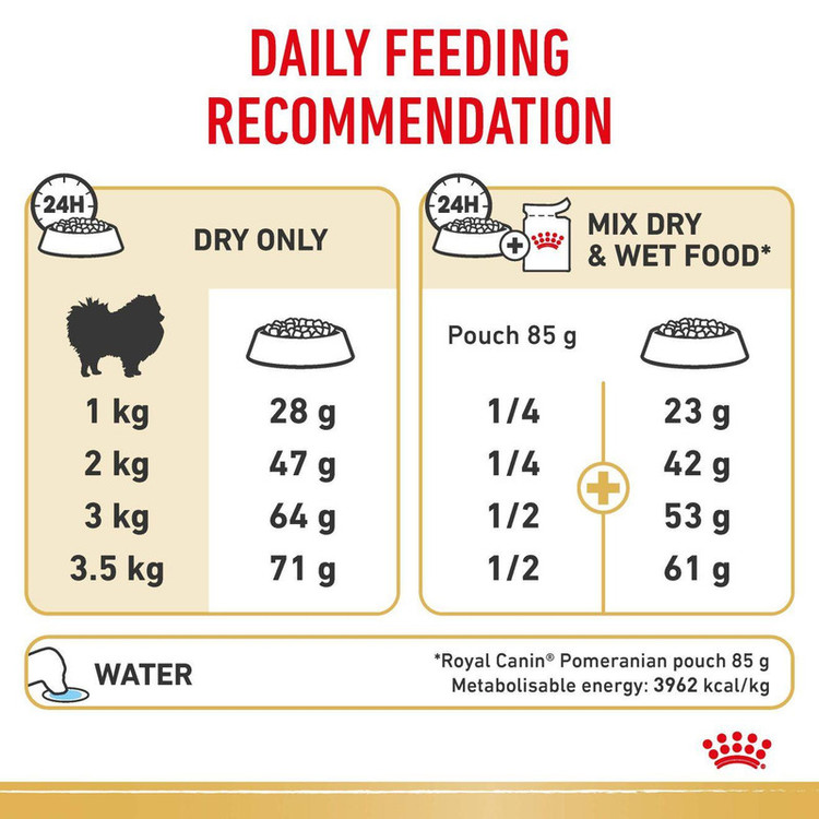 غذای سگ رویال کنین پامرانین به استحکام مفاصل، استخوانها وانو در این نژاد کوچک و ظریف کمک فراوانی میکند. حاوی مجموعه کاملی از فیبرهای با قدرت جذب بالا و پروتئینهای بسیارود جذب موجب بهبود کارکرد سیستم گوارشی سگ میشود. در ضمن، تکههای غذا در این غذا سایز کوچکی دارند که یکی از انداههای مناسب برای دهان همیشه کوچک سگهای پامرانین است.