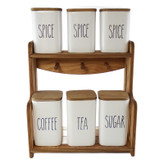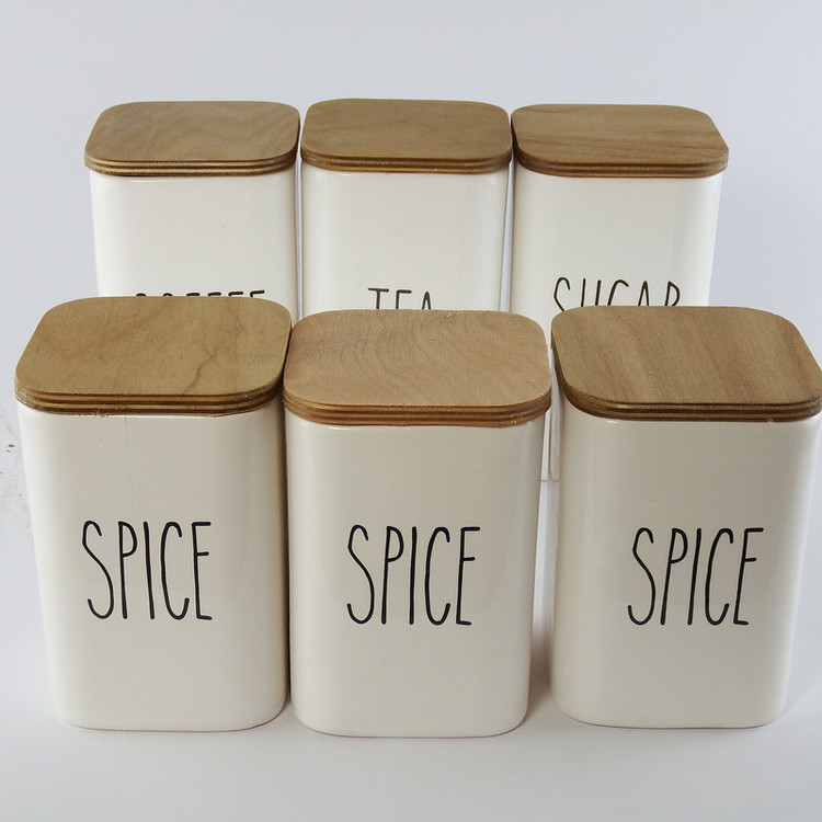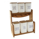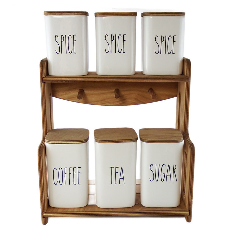 این ست جا ادویه تشکیل شده است از 6 عدد بانکه (بدون واشر) با قطر 9 سانتیمتر که 3 عدد آن به ارتفاع 15 سانتیمتر و 3 عدد آن به ارتفاع 12 سانتیمتر که دارای یک استند و دربهای چوبی از جنس پلی وود ضد آب (نه MDF )با طراحی منحضر به فرد که هر بانکه در جایگاه خود قرار می گیرد
