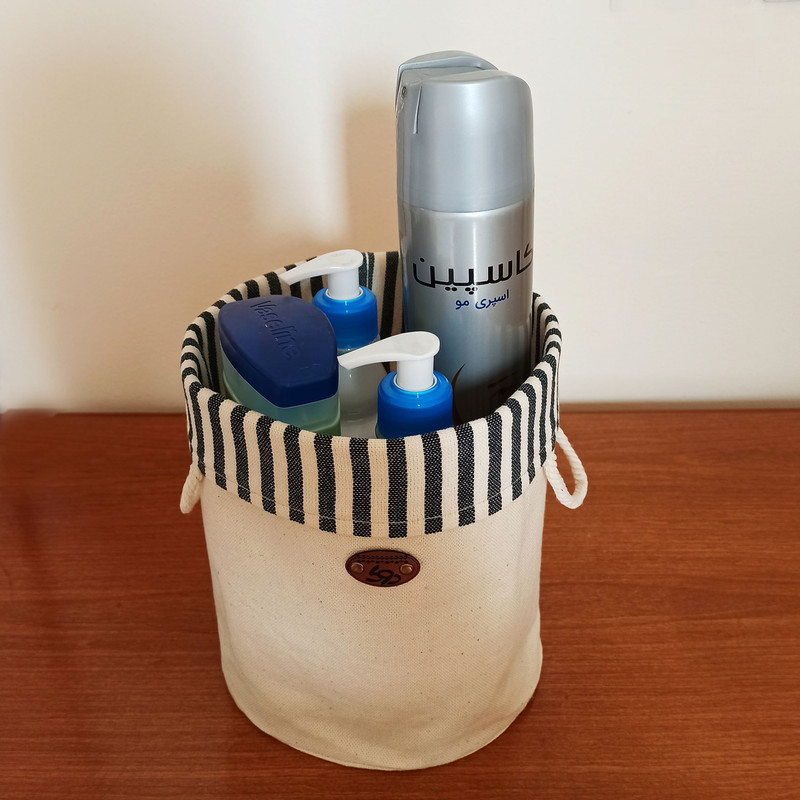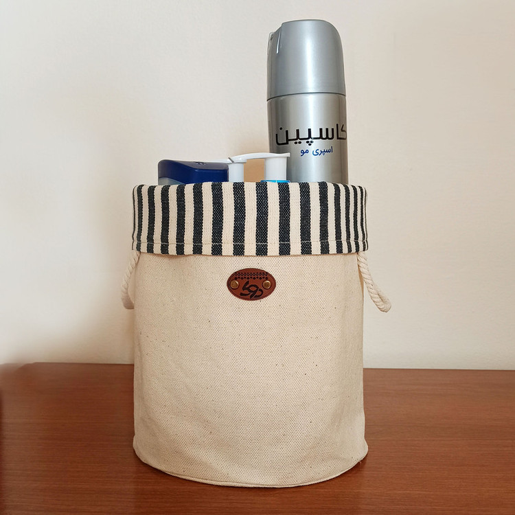 باکس نظم دهنده استوانه ای ،دوخته شده با پارچه جودون ،بسیار مقاوم و با کیفیتمیباشد.داخل کار با پارچه کنفی مقاوم کار شده است.کار کاملا قابل شستشو و قابل اتو خوردن است. دو دسته مقاوم برای حمل راحتتر ،کار شده است.