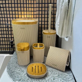 ست سرویس بهداشتی 6 پارچه طرح روما شیاردار چوب دارای سطل بادبزنی می باشد و این ست دارای سطل زباله، فرچه توالت شور، جامایع، جاصابونی، جا مسواکی و جای دستمال توالت می باشد.