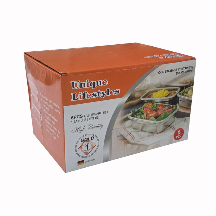 هر بسته از این محصول دارای 6 تکه می باشد که شامل 3 ظرف غذای استیل و 3 درب پلاستیکی می باشد.