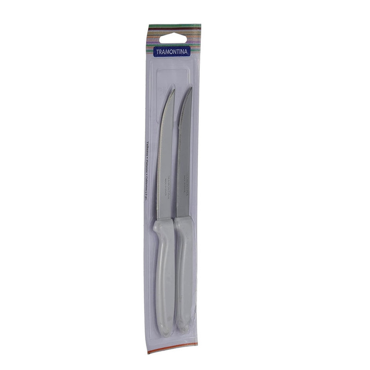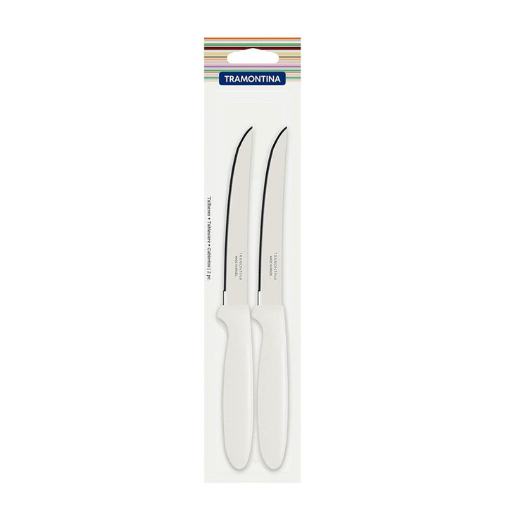 چاقوی ترامونتینا مدل Ipanema داری دو عدد چاقو با تیغه اره ای تیز و مقاوم از جنس استیل ضدزنگ و دسته از جنس پلاستیک با کیفیت و طراحی ارگونومیک می باشد. به دلیل طراحی اره ای شکل تیغه، برش میوه و سبزیجات حتی انواع نرم و آبدار آن به راحتی و سرعت انجام می گیرد. این چاقو مناسب برش انواع استیک و گوشت پخته نیز می باشد. این محصول ساخت کشور برزیل است.