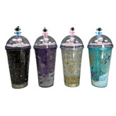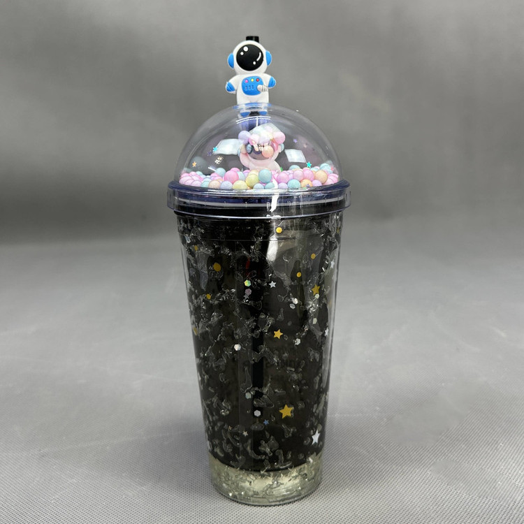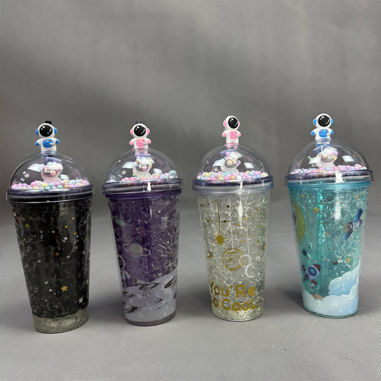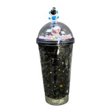 لیوان اسموتی دوجداره دارای درب چفتی به همراه نی نوشیدنی تزئین شده با طرح ستاره و فضانورد روی درش عروسک تزئینی داره مناسب برای سرو انواع نوشیدنی ، آبمیوه و اسموتی نگهدارنده دمای سرد برای چند ساعت نحوه استفاده از این لیوان ها به این صورت که لیوان رو به صورت برعکس 3الی4 ساعت داخل فریزر بزارید ، بین جداره های این لیوان یه سری شیشه خورده مانند هست که بهش میگن سیلیکوژل ، این سیلیکوژل های شیشه ای این خاصیت رو دارند که سرما رو به خودشون جذب کنند و وقتی نوشیدنیتون رو میریزد در لیوان براتون تا چند ساعت خنک نگه میداره.