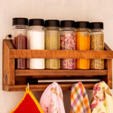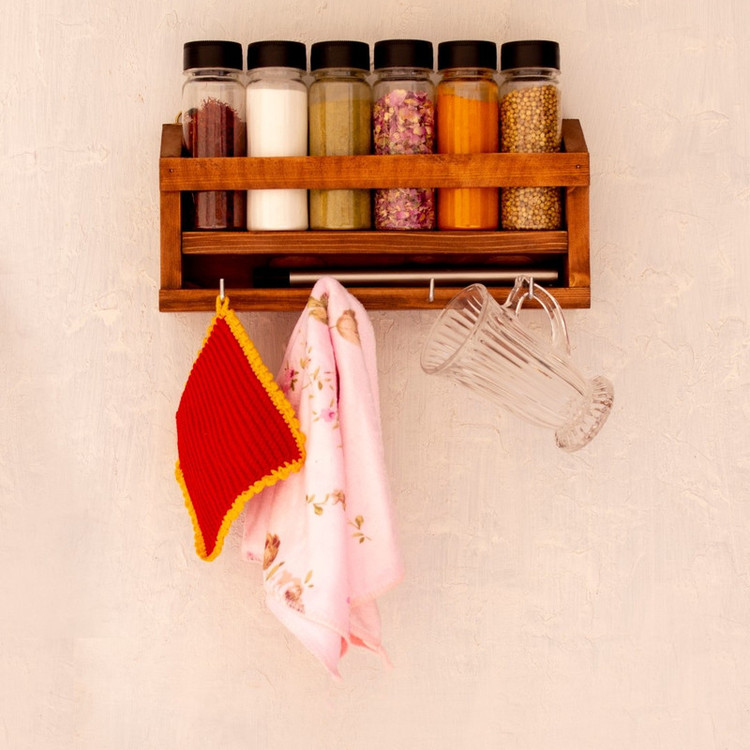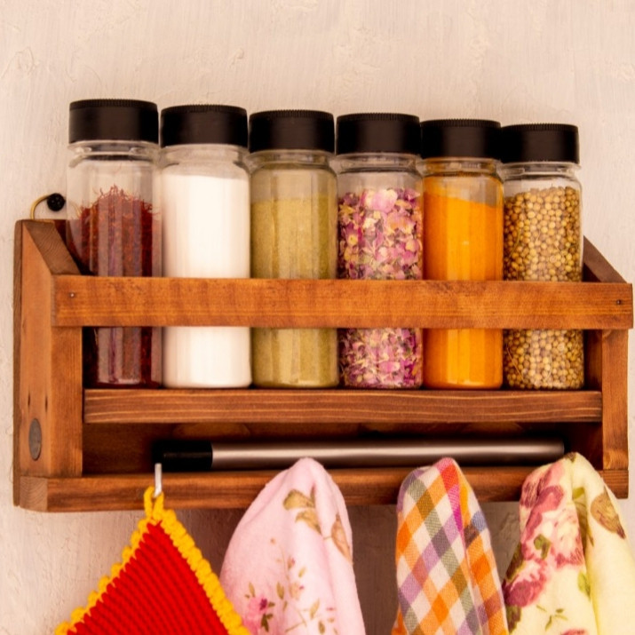 جای ادویه 6 پارچه هَندیشو مدل avina کد T4 ساخته شده از چوب به همراه 6 عدد ادویه ماش با درب پیچی 3 حالته با قابلیت شست و شو ظروف ادویه پاش با 4 قلاب آبکاری کروم برای آویز اکسسوری (قابلیت جدا شدن قلاب و استفاده رومیزی ) داری محفظه به عمق 4 سانت برای قرار گیری وسایل .