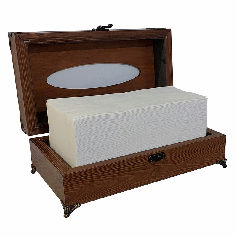 بدنه جعبه از جنس پی وی سی با بهترین کیفیت و برش و مونتاژ دقیق ساخته شده است . متعلقات تزیینی محصول فلزی و سربی با آبکاری درجه یک میباشند. این جعبه گنجایش بسته های دستمال کاغذی تا 500 برگ را داراست. از جمله ویژگی های محصول می توان به بغل باز شو بودن آن اشاره کرد که کاربری آن را بسیار راحت و آسان کرده است. با توجه به طرح چوبی جعبه می توانید این محصول زیبا را با انواع مختلف دکوراسیون ها ست کنید.
