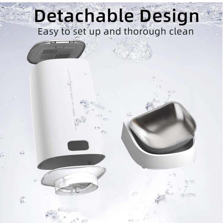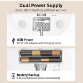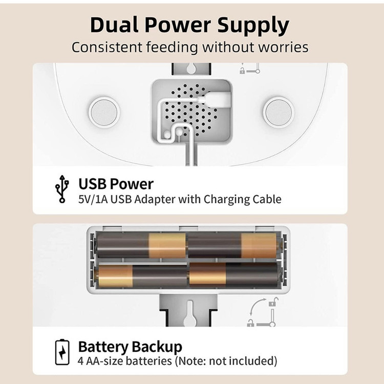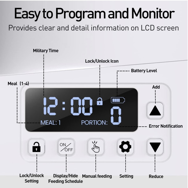 قطعات و کاسه غذای استیل ضد زنگ این ظرف غذای اتوماتیک گربه و سگ برای تمیز کردن کامل قابل جدا شدن است. کیسه خشک کن تعبیه شده با روکش درزگیر، غذا را تازه نگه می دارد. تنها چیزی که ما می خواهیم این است که زندگی تمیزتر و سالم تری برای حیوان خانگی شما فراهم کنیم! ROJECO از توله سگ شما مراقبت می کند. : پخش کننده غذای گربه ما آداپتور 5 ولت و کابل شارژ USB را در بسته ارائه می دهد. سیستم پشتیبان باتری (4 باتری سایز AA، شامل نمیشود) تضمین میکند که سگها یا گربههای شما هرگز یک وعده غذایی را از دست نمیدهند، حتی اگر منبع تغذیه خانه شما قطع شود. طراحی ضد گرفتگی قابل اعتماد؟: فقط برای غذای خشک مناسب است، اندازه گلوله غذا در عرض 4-12 میلی متر بهتر است. ساختار مکانیکی پیشرفته برای حل مشکل انسداد مواد غذایی طراحی شده است. سنسور مادون قرمز داخلی ذخیره غذا را تشخیص می دهد، اگر غذا کافی نباشد، فیدر قسمت صفر را روی صفحه LED نشان می دهد. مونتاژ و برنامه ریزی آسان است؟: فقط چند دقیقه طول می کشد تا این تغذیه گربه را جمع آوری کنید. اطلاعات واضح و دقیق روی صفحه LED نشان داده می شود. برنامه ریزی تغذیه با فشار دکمه آسان است. این فوق العاده است که به حیوان خانگی خود کمک کنید تا یک عادت غذایی خوب و کنترل بخش را ایجاد کند. توجه: این مدل دکمه را نمی توان توسط برنامه ROJECO کنترل کرد. حیوانات خانگی را طبق برنامه تغذیه کنید؟: تغذیه خودکار ROJECO 4L به شما امکان می دهد برنامه تغذیه را تنظیم کنید، 1-4 وعده در روز و حداکثر 60 وعده در هر وعده (0.2 اونس در هر وعده). برای غذا دادن به گربه ها یا سگ های خود با تنظیم یک برنامه غذایی زمانی که شب ها اضافه کاری دارید یا روزها سفر می کنید. تغذیه گربه خودکار مطمئناً مجهز به عملکرد تغذیه دستی است تا به راحتی با فشار دادن دکمه به حیوانات خانگی خود پاداش دهید.