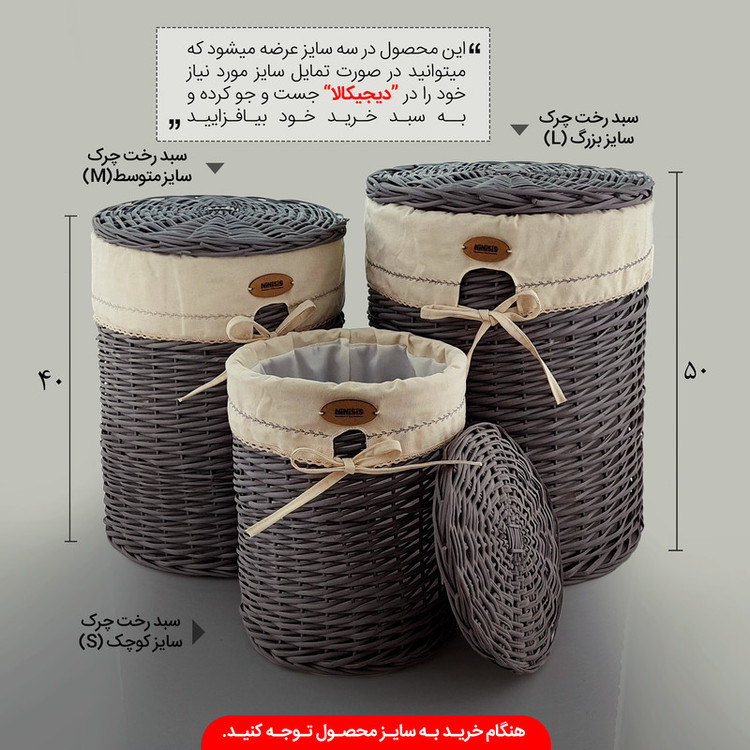 این سبد رخت چرک زیبا یک پیشنهادی عالی و انتخابی ایده آل هم برای تزئین اتاق و هم برای جمع آوری و نگهداری از لباسهای کثیف تا زمان شستوشو می باشد. چرا که این سبدها برخلاف برخی از محصولات پارچهای و پلاستیکی و چرمی که لباسها درون آنها به شدت بو میگیرند و سبب تولید میکروب و باکتری می شوند به دلیل جنس چوبی حصیری ای که دارند مانع از ایجاد بوی نامطبوع در لباسها می شود و تا حد بسزایی رطوبت موجود در البسه را به خود میگیرد تا مانع از پوسیدگی لباس و بوی نامطبوع گردد. علاوه بر این بدنه و درپوش سبد با توجه به حفره های ریزی که بینشان هست سبب میگردد هوا از بین دیوارهها عبور کند که این امر از تشدید بوی برخی لباسهای چرک جلوگیری می کند. حصیر بهکار رفته در سبد هم علاوه بر اینکه از مقاومت و استحکام بسیار خوبی برخوردار است، داخل سبد هم یک استر پارچه ای با کیفیت تعبیه شده که به سادگی از سبد جدا میشود و قابل شست و شو است. اما پیش از خرید این محصول به سایز و رنگ آن توجه کنید چرا که این سبد ها در 3 سایز بزرگ، متوسط و کوچک و 2 رنگ طوسی و قهوه ای عرضه و ارائه میشوند. که تنها تفاوت رنگ آن در رنگ سبد آن است. و پارچه داخلی همه سبد ها استخوانی رنگ هستند.