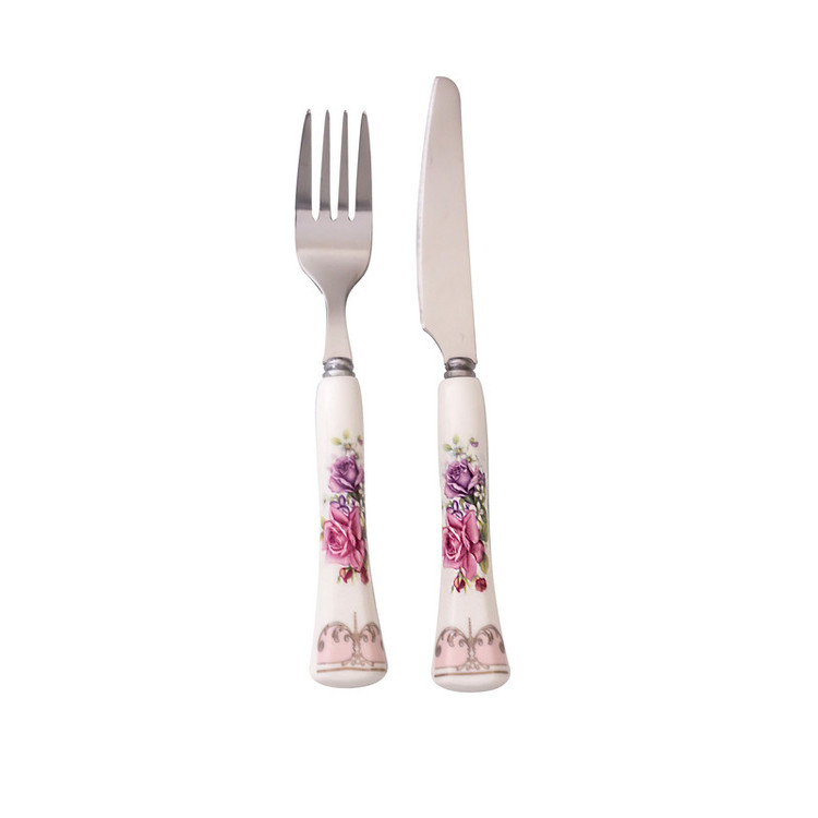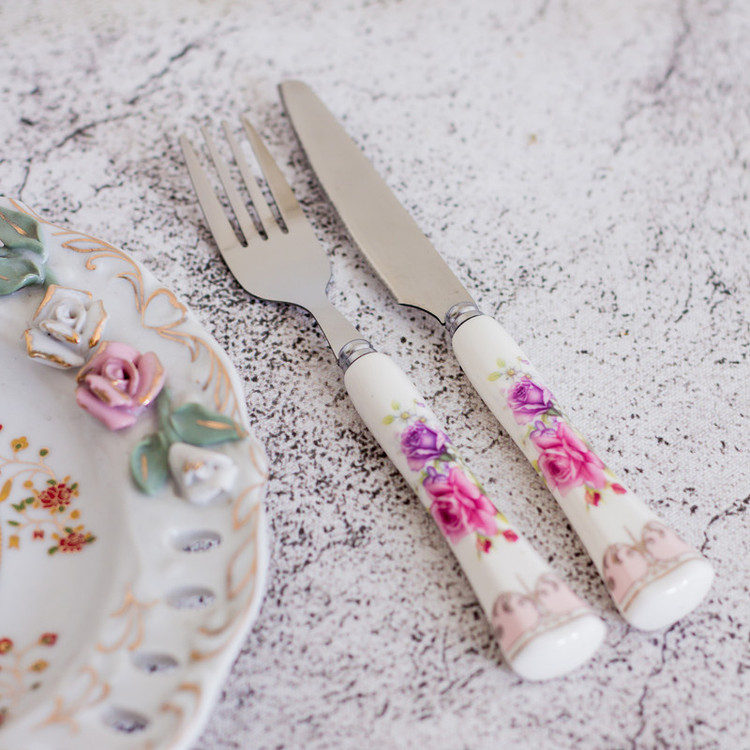 کارد و چنگال میوه خوری 12 پارچه مدل دسته سرامیکی گلدار