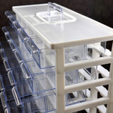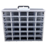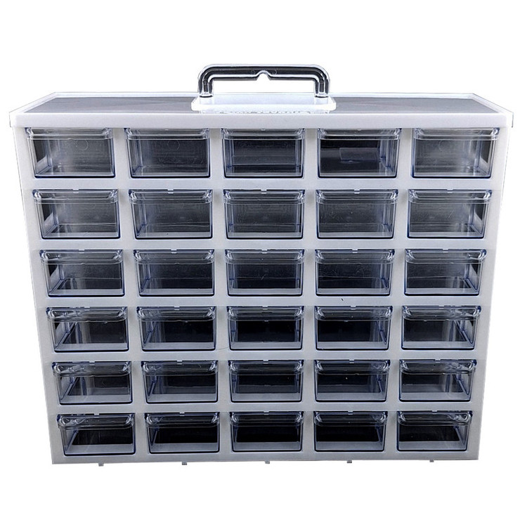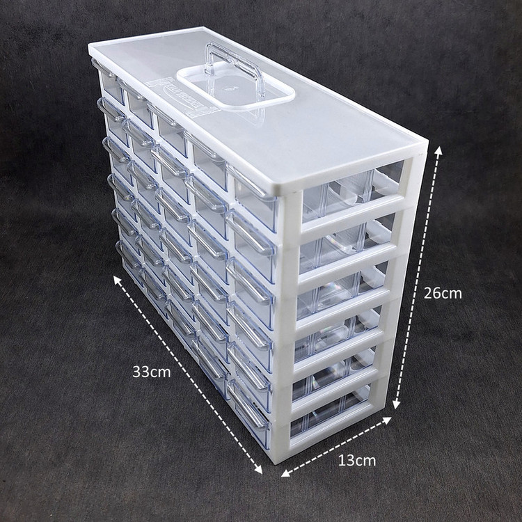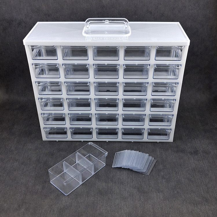 ست جا ادویه 30 پارچه کیان تکنیک مدل A06 ( 6 طبقه در 5 ردیف 30 کشویی ) محصولی است ایده آل برای نظم دادن به ادویه جات و سایز لوازم ریز از جمله لوازم خیاطی، خراطی و ... که با توانایی چیدمان بالا و راحتی استفاده ای که دارد نظم و آرامش را برای شما به ارمغان می آورد. این ارگانایزر محصولی ایده آل برای نظم دادن به محیط آشپزخانه، انبار، کارگاه، دفتر، تعمیرگاه، آزمایشگاه و ... است. این محصول مناسب قطعات ریز الکترونیکی مانند ال ای دی، خازن، مقاومت، ترانزیستور، آی سی و انواع و اقسام قطعات دیگر است. همچنین برای وسایلی دیگر مانند پیچ و میخ، کلید، دکمه، سوزن و هزاران قطعه ریز دیگر مناسب می باشد. با خرید این جعبه می توانید به محیط کار خود نظم دهید و به سرعت اقلام مورد نیاز خود را پیدا کنید. همچنین می توان از آن برای اهداف آموزشی نیز استفاده کرد. این باکس در قسمت بالایی دارای دسته ای برای سهولت جابجایی است. این جعبه قطعات از کیفیت بالایی برخوردار است و جنس بدنه آن پلاستیک ABS است و نسبت به محصولات مشابه ارزش خرید بالایی دارد. ابعاد این جعبه ارگانایزر 33x26x13 سانتی متر و ابعاد کشوهای آن 12x6x4 سانتی متر می باشد. ضمنا داخل کشوها تعدادی جدا کننده موجود است که برای جدا کردن ادویه ها و سایر لوازم کاربردی مورد استفاده قرار می گیرد.
