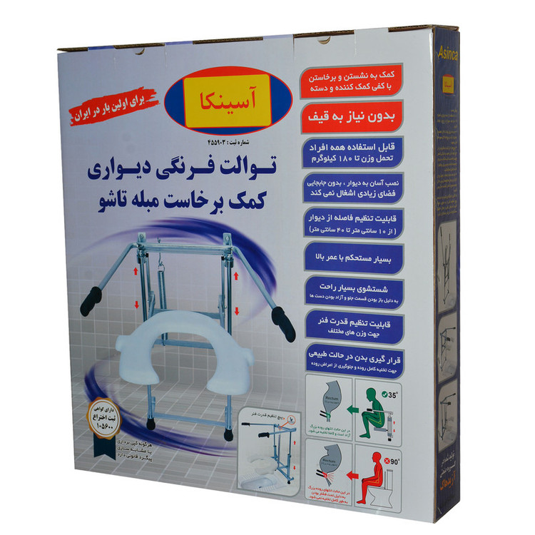 توالت فرنگی دیواری کمک برخاست اختراعی جدید است که تنها با دو عدد پیچ بر روی توالت معمولی ایرانی نصب میشود و برای همه ی افراد مناسب و قابل استفاده است که کمک به نشستن و برخاستن فرد میکند و از نظر پزشکی مشکلات و محدودیت های توالت فرنگی را ندارد و برای هر قد و وزن و هر سن و سالی با پیچ تنظیم قدرت فنر و تنظیم ارتفاع قابل تنظیم است همچنین نیازی به قیف ندارد زیرا بدن فرد را دقیقا در حالت تخلیه ی کامل روده قرار میدهد بدون فشار به کمر و زانو و کفی آن برای انواع توالت ایرانی با فاصله های متفاوت از دیوار قابل تنظیم است همچنین قابلیت جمع شدن به دیوار با گرفتن کمترین فضای ممکن را دارد و به خاطر وجود میله های پر قدرت عمر و استحکام بسیار بالایی دارد و تمام مشکلات و محدودیت های توالت فرنگی از جمله سرطان روده بواسیر و... را برطرف نموده و بدون فشار به زانو و کمر فرد تخلیه ی روده به صورت کامل انجام میشود و لازم نیست همانند توالت فرنگی معمولی فرد فشار زیادی به روده بیاورد