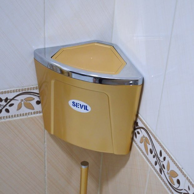سطل مثلث شکل سویل برای کنج دیوار طراحی شده و فضای بسیار کمی در حمام و سرویس بهداشتی اشغال میکند این سطل بدون سوراخکاری روی دیوار نصب میگردد . این سطل با چسب سیلیکونی (اکواریوم)نصب میشود و بسیار با دوام است