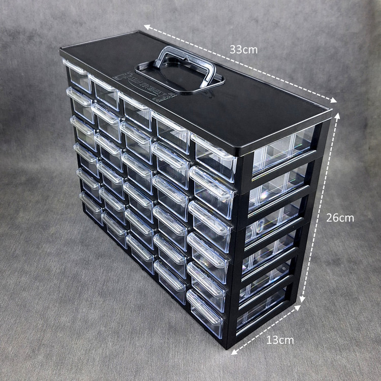 ابعاد این جعبه ارگانایزر 33x26x13 سانتی متر و ابعاد کشوهای آن 12x6x4 سانتی متر می باشد.