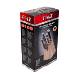 سرویس 8 پارچه جی ام زد دارای دسته ارگونومیک - تیغه آلمانی - جنس تیغه استیل ضد زنگ می باشد این سرویس قابلیت قرار دادن در ماشین ظرفشویی را دارد که شامل : ساطور به طول ۱۷ سانتیمتر - چاقو برش گوشت به طول ۲۰ سانتیمتر - چاقو برش نان به طول ۱۹ سانتیمتر - چاقو برش میوه به طول ۱۳ سانتیمتر - چاقو برش میوه به طول ۸.۵ سانتیمتر - چاقو تیز کن به طول ۳۰ سانتیمتر - قیچی به طول ۲۶ سانتیمتر و دارای قفل و استند می باشد