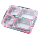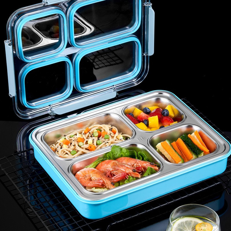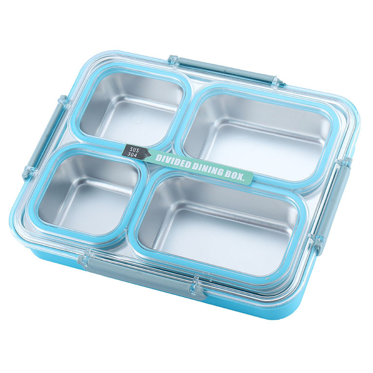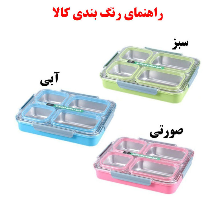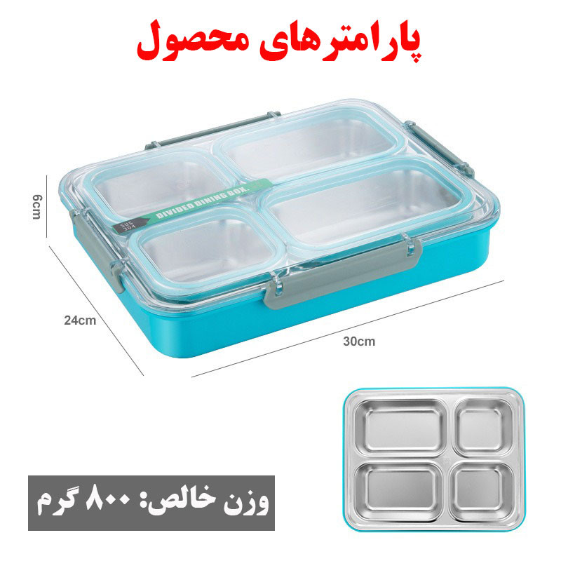 ظرف غذا استیل یک وسیله عالی و کاربردی برای نگهداری و مواد غذایی و نگهداری اضافه غذا است. از آنجا که متریال استیل ساخته شده برای این ظروف از جنس استیل ضد زنگ بوده و خاصیت اصلی استیل بهداشتی و مواد اولیه و سالم نگه داشتن مواد غدایی است. به همین خاطر استفاده از ظرف غذا های لانچ باکس های استیل هم برای محل کار و هم ظرف غذای مدرسه بسیار پرطرفدار است. این محصول دارای 4 قسمت با اندازه های مختلف است. دو قسمت بزرگتر ظرف میتوانند حدود 600 میلی لیتر غذا را در خود جای دهد و استفاده مناسب برای انواع خورشت های مایع یا سوپ و غیره ...... دو قسمت کوچکتر ظرف میتوانند حدود 300 میلی لیتر غذا را در خود جای دهد و مناسب برای سالاد ها یا خوراک های خشک و استیک و غیره ..... است.