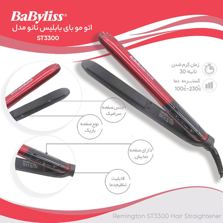 اتو مو بای بابیلیس نانو مدل ST-3300 ساخت درجه یک کشور چین ( MADE IN P.R.C) است. برند بای بابیلیس نانو با ساخت محصولات متنوع و کیفیت بالا توانسه جایگاه مناسبی در بین مصرف کنندگان لوازم برقی آرایشی بهداشتی برای خود ایجاد کند. یکی از نقاط مثبت این اتو مو گرم شدن سریع در 30 ثانیه است. لبه های گرد این محصول به شما کمک میکند علاوه بر صاف کردن مو بتوانید مو را دور اتو پیچیده و تا حدودی به مو حالت دهید. ابعاد این اتو مو برابر 4×4×30 سانتیمتر میباشد. از دیگر ویژگی های بارز این اتو مو طول سیم 2 متری و چرخان این محصول است به این صورت که سیم از قسمت اتصال به اتو مو به صورت در 360 درجه میچرخد و قدرت مانور شما در هنگام استفاده را زیاد میکند. دمای این اتو مو قابل تنظیم از 100 تا 230 درجه میباشد. طول صفحه سرامیکی 12 سانتیمتر و عرض آن 3 سانتیمتر است. بدنه و متریال استفاده شده دارای کیفیت بسیار بالایی است و دارای صفحه نمایش دیجیتالی میباشد.