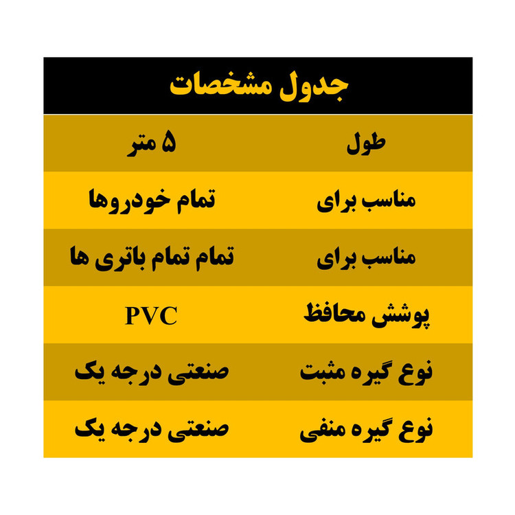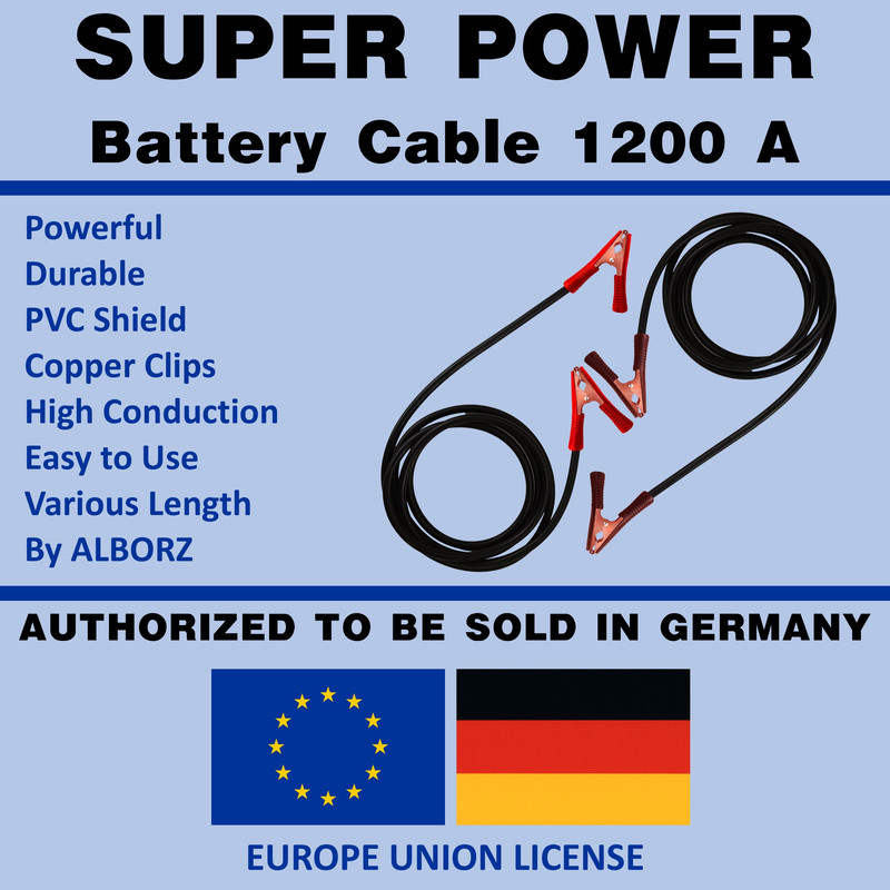 کابل اتصال باتری به باتری یک وسیله ضروری برای تمام خودروها است. این کابل میتواند در شرایط اضطراری به شما کمک کند. با استفاده از این وسیله در مواقع اضطراری که باتری خودروی شما خوابیده است خواهید توانست موتور خودرو را مجدداً استارت بزنید و آن را روشن کنید. پوشش این کابل از جنس پی وی سی PVC بوده و در مقابل خوردگی، روغنهای صنعتی، ضربه، تابش نور، سرما و گرما مقاوم است. کابل اتصال باتری به باتری خودرو مدل سوپر پاور Superpower 1200A با بهره گیری از گیره های باکیفیت و محکم قابلیت اتصال به انواع باتری و سرباتری را داشته و قادر خواهد بود عملیات باتری به باتری را برای تمام اتومبیل های سبک و سنگین انجام دهد. در مواقعی که خودروی شما به دلیل پایان عمر باتری روشن نیمشود، میتوانید با استفاده از کابل باتری به باتری خودرو مدل سوپر پاور Superpower 1200A دوباره آن را روشن کنید. این کابل فوق العاده با دوام، مقاوم، کارآمد، رسانا، با پوشش محافظ پی وی سی است و در طولهای مختلفی عرضه میشود. برای استفاده کافی است ابتدا گیره های قرمز سرخ رنگ را به سرباتری مثبت باطری ها و سپس گیره های سیاه مشکی رنگ را به سر باتری منفی باتری ها متصل نموده و سپس خودروی خاموش شده را استارت بزنید. در انتها میتوانید با خیال راحت گیره ها و کابل ها را جدا کنید. این کابل فوق العاده با دوام، مقاوم، کارآمد، رسانا، با پوشش محافظ پی وی سی است و در طولهای مختلفی عرضه میشود.
