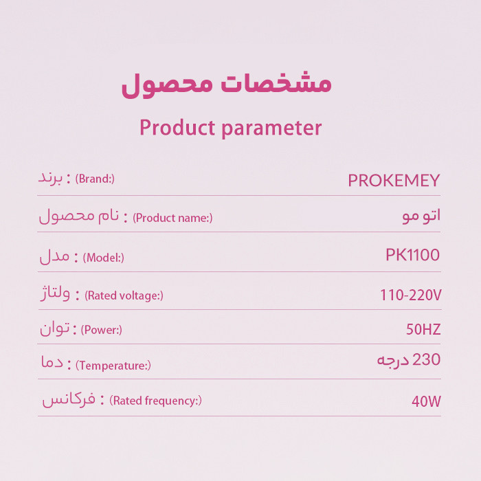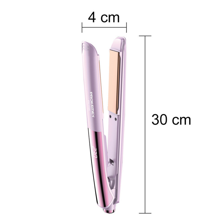 اتو مو پروکیمی مدل PK1100 صفحه پهن یک دستگاه کاربردی است که برای صاف کردن مو طراحی شده است. که با توجه به متریال مرغوب به کار رفته مورد تایید استاندارد اروپا CE قرار گرفته است. این دستگاه دارای صفحات از جنس نانو سرامیک می باشد. همچنین سرامیک این خاصیت را دارد که تمام محور دستگاه بهصورت یکنواخت گرم میشود لذا از آسیب دیدن موها در اثر بالا رفتن بیش از حد دما جلوگیری میکند. اتو مو پروکیمی مدل PK1100 محصولی بسیار کاربردی است که برای استفاده ی شخصی و یا استفاده در آرایشگاه مناسب می باشد. در ساخت بدنه این محصول از مواد اولیه مناسب استفاده شده است که مقاومت بالایی در برابر گرمای بالا به محصول بخشیده است. حداکثر دمای این اتو مو 230 درجه سانتی گراد است که شما با استفاده از آن می توانید به آسانی موهایتان را صاف کنید. همچنین اتو مو پروکیمی مدل PK1100 قابلیت تنظیم دما تا 220 درجه سانتی گراد را دارد و هر شخصی می تواند متناسب با جنس و نوع موی سر خود آن را تنظیم کند. این اتو مو دارای دو صفحه پهن از جنس نانو سرامیک پیشرفته است که در مقابل صفحه های فلزی طرفدار بیشتری دارد. صفحات به کار رفته در اتو مو پروکیمی مدل PK1100 گرمای موجود در خود را برای مدت نسبتا طولانی حفظ کرده و شما می توانید تا ساعت ها بدون نگرانی به صاف کردن موهایتان بپردازید. مدت زمان تقریبی برای گرم شدن کامل اتو مو 30 ثانیه تخمین زده شده است که زمان بسیار مناسبی می باشد و شما می توانید بدون فوت وقت و در کوتاه ترین زمان ممکن پس از اتصال آن به منبع انرژی، به استفاده بپردازید. نمایشگر LED دمای آن را نشان می دهد که این موضوع مورد توجه بسیاری از خریداران می باشد.