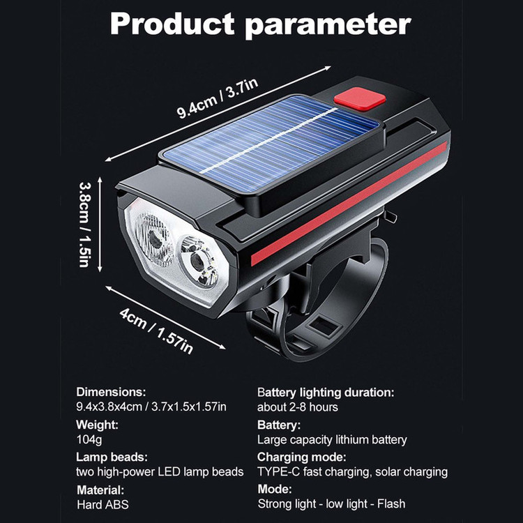 این محصول یک چراغ جلو دوچرخه با قابلیت شارژ خورشیدی و درگاه Type-C است. در ادامه، نقد و بررسی این کالا بر اساس اطلاعات تصویر ارائه میشود.