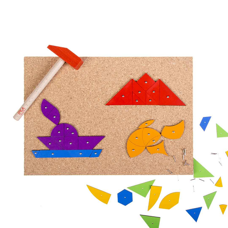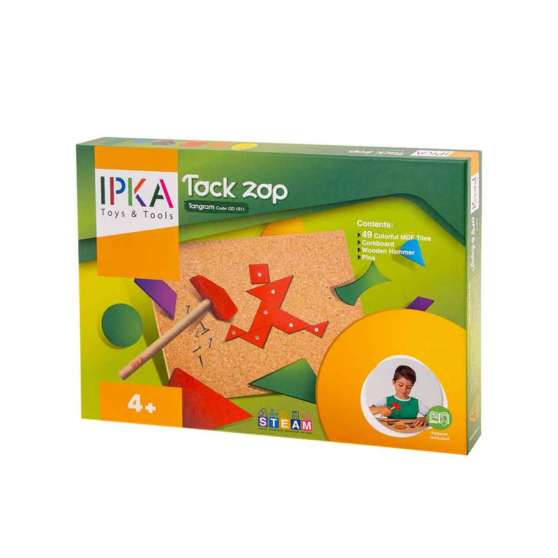 بازی میخ و چکش تنگرام، یک بازی فکری مناسب برای گروه سنی 3 تا 9 سال است که شامل 49 قطعه چوبی در رنگها و اشکال متنوع بوده و با استفاده از چوب باکیفیت و رنگ پایه آب به منظور حفظ سلامت کودک ساخته شده است. بازی میخ و چکش جهت تقویت هماهنگی بین چشم و دست کودک و افزایش مهارت در دست گرفتن ابزار و تقویت قدرت تجسم هندسی ذهن کودک، برای کودکان تهیه شده است. در بازی میخ و چکش تگرام، کودک قطعات چوبی را روی یک صفحه چوب پنبهای میکوبد و در حین بازی یاد میگیرد که از کنار هم قرار دادن این قطعات، تصاویر ذهنی خود را خلق کرده و داستانسرایی کند. این بازی در کنار سرگرمی، کودک را با اشکال هندسی آشنا میسازد و همچنین مهارت در دست گرفتن ابزار و تنظیم حرکات دست و کوبش را به او میآموزد. این بازی فکری و آموزشی در راستای متدهای مونته سوری است. بازی میخ و چکش تَنگرام، یکی از مجموعههای میخ و چکش ایپکا است که از اشکال تنگرام تشکیل شده است. تنگرام از قطعات هندسی ساده تشکیل شده است و این امکان را فراهم میکند که با تغییر محل و زاویه قرار گرفتن این قطعات اشکال متنوعی اعم از حیوانات، پرندگان، انسانها و اشیا را به وجود آورد. در بسته موجود 6 مدل تنگرام (مربع، مستطیل، دایره، مثلث، تخم مرغی و قلب) در رنگهای متنوع و در قالب بازی با میخ و چکش ارائه شده است. بازی با میخ و چکش تنگرام علاوه بر سرگرمی، یادگیری اشکال و رنگها، آشنایی با مبانی هندسه، تقویت خلاقیت و پرورش مهارت حرکتی را به همراه دارد.