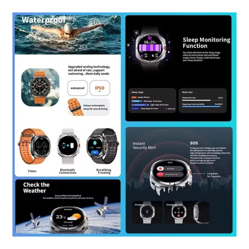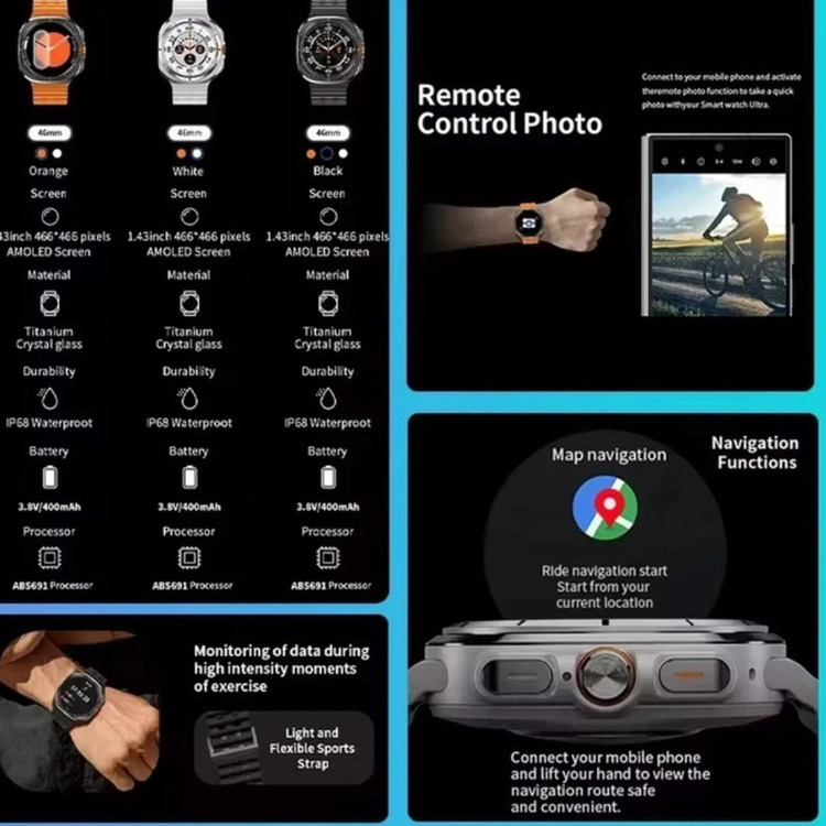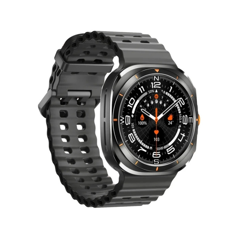 حدود دو ماه پیش بود که ساعت هوشمند گلکسی واچ 7 اولترا به بازار عرضه شد. اکنون به دلیل قیمت بالای این محصول ساعت هوشمند طرح گلکسی واچ اولترا Z7 Ultra، در دسترس کاربران است که میتوان آن را با ظاهری مشابه و قیمت مناسب خریداری کرد. رنگ مشکی و مات بدنه ساعت هوشمند طرح گلکسی واچ اولترا Z7 Ultra ، اولین چیزی است که به چشم کاربر میخورد. همچنین بند اوشن نارنجی با جنس سیلیکونی و رنگ نارنجی دکمه چرخان در سمت راست ساعت جذابیت بصری بسیار بالایی برای کاربران خواهد داشت. شایان ذکر است که رنگ مشکی این ساعت دارای بند سیلیکونی اوشن با رنگ مشکی میباشد. بدنه این ساعت از جنس آلومینیوم است و دارای خاصیت ضد آب با استاندارد IP68 میباشد. یعنی مقاومت خوبی در برابر پاشش آب در حین شستشوی دست و قطرات باران دارد. اما نمیتوان آن را به درون آب فرو برد. امکانات و قابلیت های این اسمارت واچ جذاب قابلیتهای مشابه ساعتهای طرح اپل واچ اولترا دارد که در زیر به بخشی از آنها اشاره شده است. 1- قابلیت مکالمه: میتوانید با این اسمارت واچ به صورت مستقیم با مخاطبان خود مکالمه کنید. به تماسها پاسخ دهید و تماسهای خروجی برقرار کنید. 2- سنسورهای سلامتی و ورزشی: این ساعت دارای سنسورهای سلامتی و ورزشی است. میتواند در حین ورزش میزان کالری مصرفی، میانگین ضربان قلب و همچنین تعداد گامهای برداشته شده را به شما نشان دهد. 3- قطب نما: قطب نما و ژیروسکوپ دو سنسور مهم و کاربردی هستند که در ساعت هوشمند طرح گلکسی واچ اولترا Z7 Ultra قرار دارند. 4- نمایش اعلانات: نمایش اعلانات فارسی و پیامکها یکی از مهمترین کاربردهای این اسمارت واچ است که با نمایشگر بزرگ آن، حس بهتری در حین استفاده به کاربر منتقل خواهد کرد. 5- تنظیم هشدار و یادآوری روزانه، نمایش میزان آب و هوا و اجرای بازیهای سرگرم کننده از دیگر قابلیتهای این ساعت هوشمند هستند که میتوان به آنها اشاره کرد.