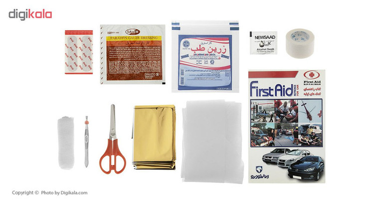 محتویات جعبه کمکهای اولیه: چسب زخم , پنس , گاز استریل , باند زخم , چسب باند , دستکش لاتکس , پد الکلی , بروشور آموزشی , گاز وازلینه , پتوی نجات , دستمال سه گوش , قیچی , چسب حلقه ای