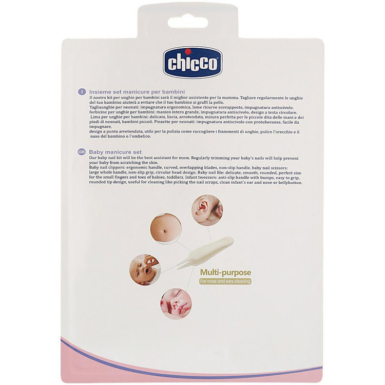 محصولی که میبیینم، ست ناخنگیر کودک از برند «چیکو» است. در این ست یک ناخنگیر کوچک، یک قیچی و یک سوهان ویک تویزر(پنس) قرار داده شده است. قیچی این کار بدنهای از جنس پلاستیک و تیغهای فلزی دارد. همچنین برای جلوگیری از آسیبرسیدن به گوشههای ناخن، سری قیچی به صورت گرد طراحی شده است. ناخنگیر این مجموعه نیز تیغه فولادی و بدنهای پلاستیکی دارد و دارای یک پنس پلاستیکی برای تمیز کردن بینی نوزاد میباشد. این ست از مواد مرغوب تولید شده و در آن مادهی مضر BPA به کار نرفته است.