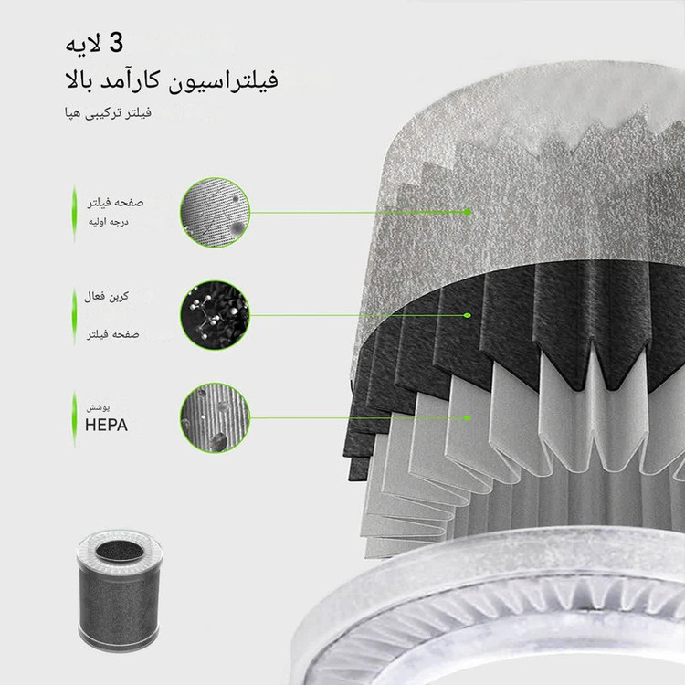 ۲- فیلتراسیون چندمرحلهای با کیفیت پزشکی: فیلتر HEPA با جذب ۹۹٫۹۷٪ ذرات معلق تا اندازه ۰٫۳ میکرون (مناسب برای گرده گل، فرمالدهید و آلایندههای ریز) ، طراحی فیلتر برای جذب مؤثر ذرات مضر بدون تولید اُزن
