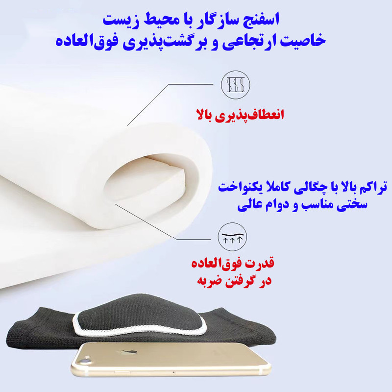زانوبند طبی ورزشی مدل آنتی شوک اسفنجی محصولی است که محافظت کامل از زانوی شما را تضمین خواهد کرد. در قسمت جلوی این محصول یک پد اسفنجی با قابلیت ارتجاعی بالا وجود دارد که با قرار گرفتن بر روی کشکک زانو از وارد شدن هر گونه ضربه یا آسیب به زانوی شما جلوگیری میکند. اسفنج استفاده شده در این محصول حالت خمیده متناسب با حالت زانو دارد. این اسفنج تراکم بالا با چگالی کاملا یکنواخت دارد و قابلیت انعطافپذیری و ارتجاعپذیری فوقالعاده بالایی دارد و قدرت بالایی در گرفتن ضربات وارد شده به زانو را دارد. انعطافپذیری بالای اسفنج باعث میشود که این محصول هیچگونه محدودیتی در حرکات زانو ایجاد نکند و در زمان استفاده کاملا راحت باشد. جنس اسفنج کاملا سازگار با محیط زیست و بدون ایجاد حساسیت است. پارچه محصول نیز به صورت تمام کش و کاملا جذب است تا در زمان فعالیتهای ورزشی هیچگونه حرکت یا چرخش بر روی زانوی شما نداشته باشد. این زانوبند از تنفسپذیری بالایی برخوردار است و در فعالیت های ورزشی باعث تعریق بیش از حد نخواهد شد. همچنین جنس محصول جاذب رطوبت و با قابلیت خشک شدن سریع است.