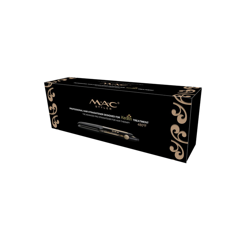 این محصول ساخت شرکت مک استایلر با گستره دمای250 الی 480 درجه فارنهایت معادل 80 الی 230 درجه سانتی گراد ، همراه با دارای چهار عدد گیره مو و همچنین یک عدد شانه و طول سیم 2.40 متر همچنین این دستگاه مناسب استفاده برای موهای کراتین شده می باشد.