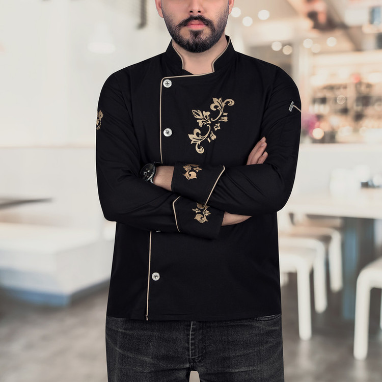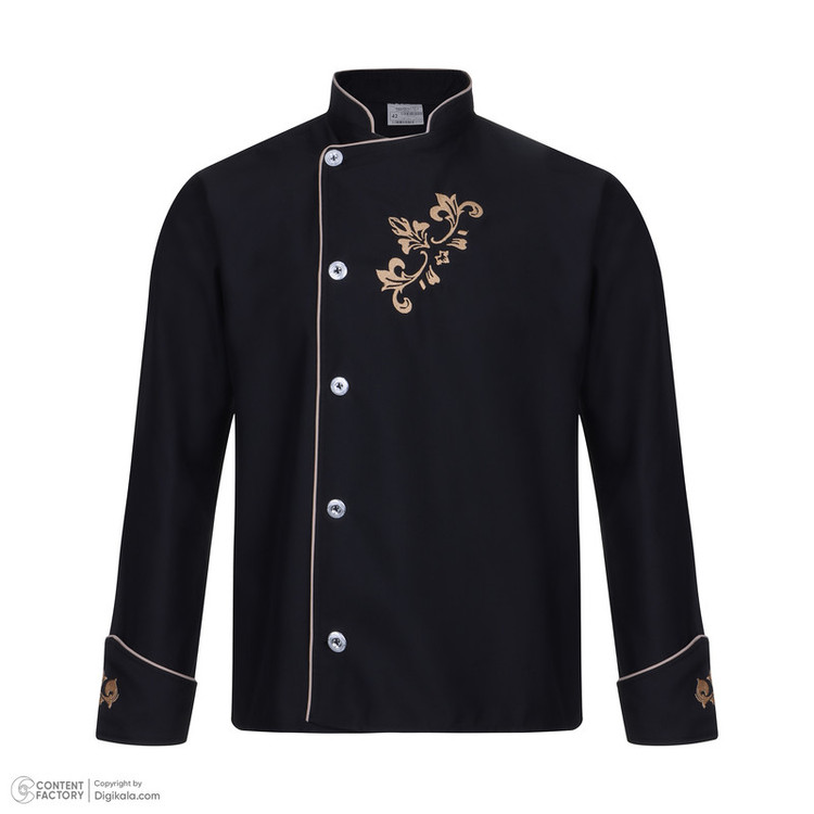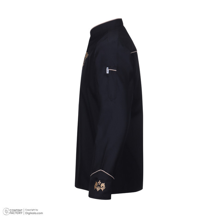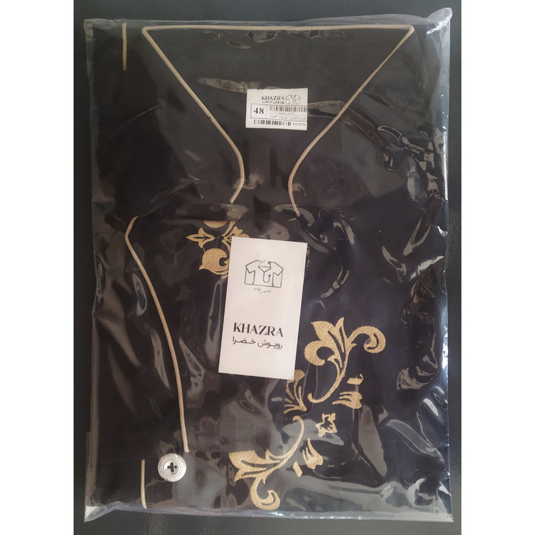 سایر توضیحات: پارچه کجراه رنگ مشکی گلدوزی طلایی آستین بلند بدون جیب