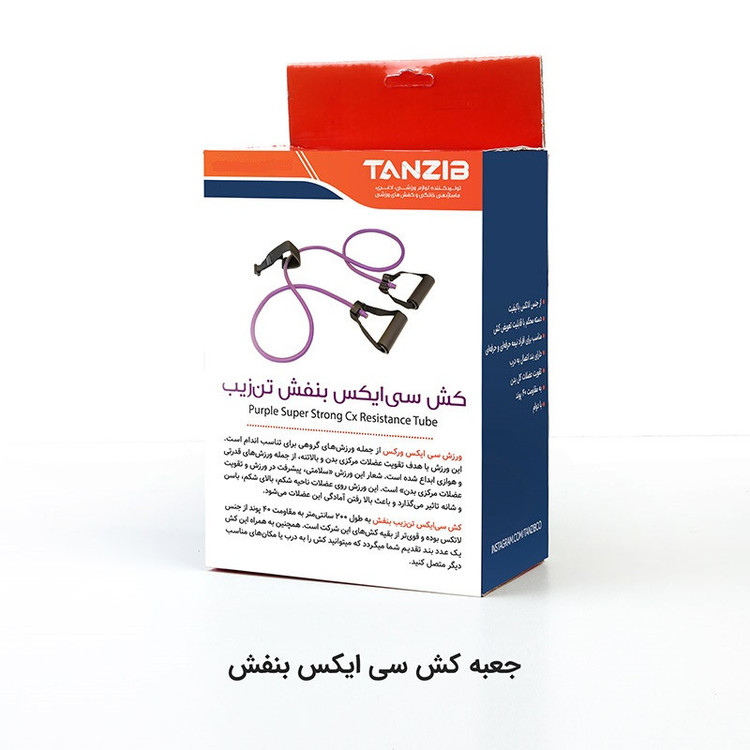 کش سی ایکس 40 پوندی بنفش تن زیب با طول 2 متر از جنس لاتکس بوده و قویترین کش ورزشی در بین انواع کشهای این شرکت است. لازم به ذکر است قدرت کش ها بر حسب رنگ آنها متفاومت می باشد که به ترتیب رنگ بنفش ، قرمز، زرد، آبی و سبز از قدرت زیاد به قدرت کم می باشد.این کش برای انجام انواع تمرینهایی که نیاز به کش دارند مناسب بوده و قابلیت کشسانی تا سهبرابر طول عادیاش را دارد. این کش ورزشی دارای یک قلاب از جنس تسمه برزنتی بسیار محکم بوده که با انداختن و فیکس کردن آن پشت در، میتوان دامنه حرکات را بسیار گسترش داد و حرکات مختلفی را باآن انجام داد. این محصول دارای جای پا نیز هست که به راحتی می توان حرکات پا رانیز با آن انجام داد.ضمنا شما میتوانید با تهیه کشهای یدکی تنزیب از چندین طول و سطح قدرت متفاوت بهرهمند شوید.