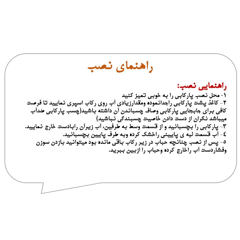 روش استفاده : برای نصب این پارکابی باید ابتدا پارکابی را تمیز کنید. سپس بخش پلاستیکی پارکابی را به بالا بکشید تا از جای خود خارج شود. سپس رکاب را به صورت کامل با اسپری آب خیس کرده و از بخش پایین و مرکز شروع به چسباندن کنید و آب را از مرکز به سمت بیرون خارج کنید