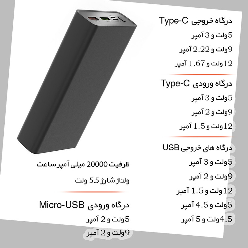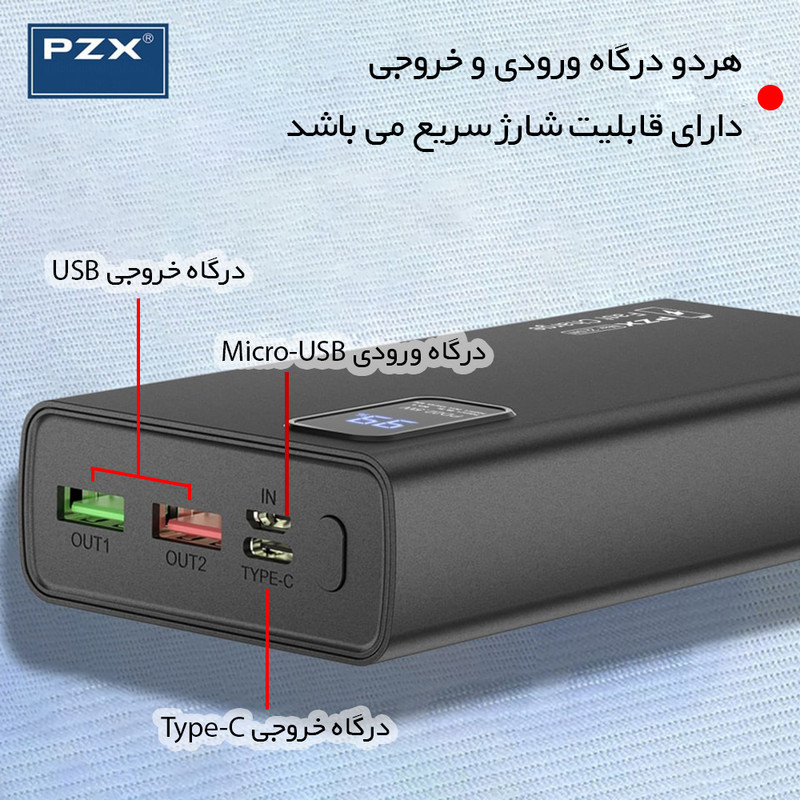 مشخصات فنی : برند معتبر PZX - ظرفیت 20هزار میلی آمپر ساعت - پشتیبانی از شارژ سریع 22.5 وات - تکنولوژی QC 3.0 - شارژ سریع PD - دارای 2 درگاه USB - دارای یک درگاه Type C - دارای یک درگاه میکرو USB