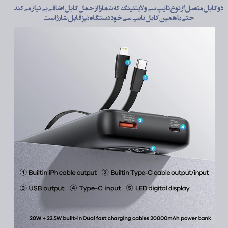 مشخصات فنی : قابلیت شارژ سریع ۲۲.۵ وات، دارای ۲ کابل همراه از انواع Type-Cو IPHONE، قابلیت اتصال و شارژ دو دستگاه مختلف به طور همزمان، ایمن و محافظت شده در برابر اتصال کوتاه، افزایش ولتاژ و جریان، بار و افزایش حرارت