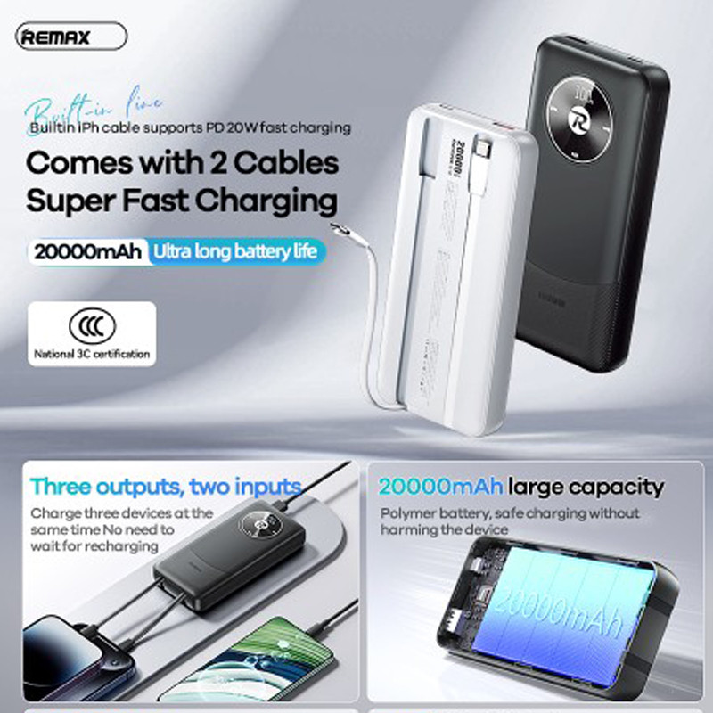 پاوربانک ریمکس مدل Fast Charge 2way ظرفیت 20000 میلی آمپر ساعت به همراه کابل USB-C و لایتنینگ
