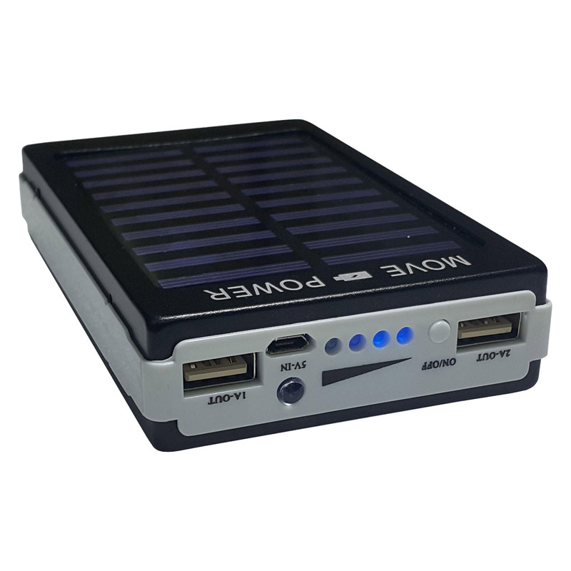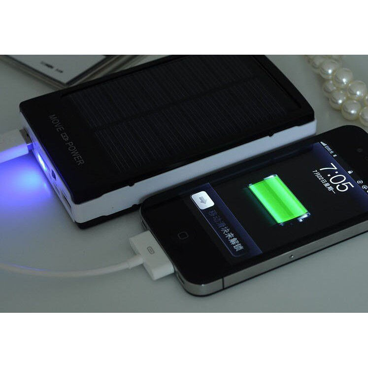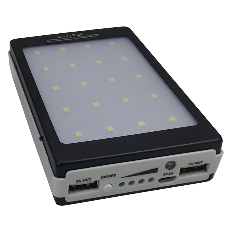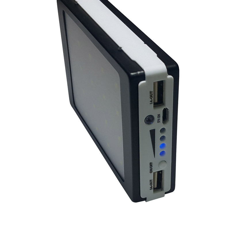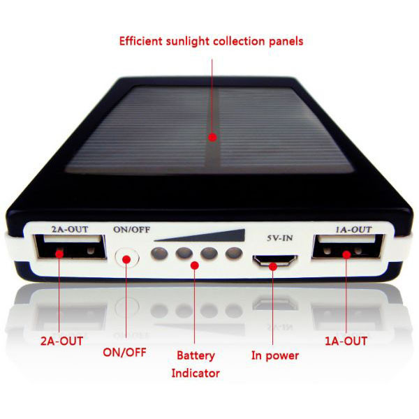 پاور بانک های خورشیدی از پر طرفدارترین محصولات سولار است زیرا میتوان آن را در سفر یا مناطق دور از برق آن را با نور خورشید یا نور لامپ های عادی شارژ نمود .باید ذکر نمود به دلیل کوچک بودن صفحه توان شارژ خورشیدی آن پایین بوده و حدود 0.1 وات می باشد که البته به نسبت اتصال به برق زمان بسیار طولانی تری برای شارژ نیازمند است. این محصول دارای یک صفحه LED قوی و بزرگ با 20 ال ای دی است که در سه حالت عادی ،چشمک زن عادی و چشمک زن سریع SOS میتواند نور قابل ملاحضه ای در اختیار شما قرار دهد . در پنل جلو دارای یک LED آبی است که میتوان برای تشخیص اسکناس اصلی استفاده نمود. چراغ نشانگر آن در حالت عادی جهت نمایش درصد شارژ و در حالت شارژ برقی یا شارژ خورشیدی نشانگر شروع شارژ می باشد . با دوخروجی usb با جریان 1 و 2 آمپر میتوان از دو خروجی جهت شارژ گوشی یا تبلت استفاده کرد
