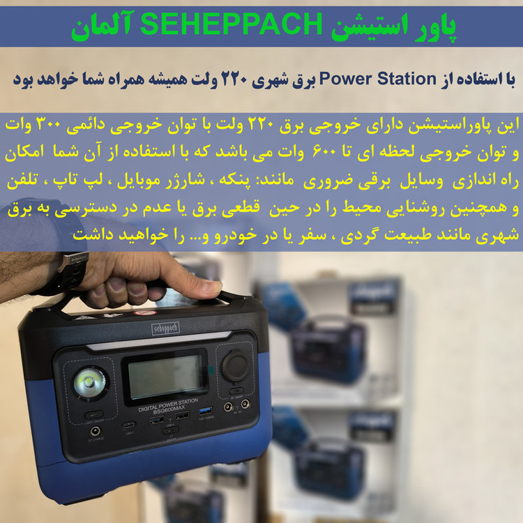 با استفاده از Power Station ها برق شهری 220 ولت همیشه همراه شما خواهد بود. پاور استیشن SEHEPPACH آلمان با ظرفیت باتری داخلی 72.800 میلی آمپر ساعت ، می تواند در رنج قیمتی مناسب خود ، یکی از بهترین انتخاب ها باشد. این پاوراستیشن دارای خروجی برق 220 ولت با توان خروجی دائمی 300 وات و توان خروجی لحظه ای تا 600 وات می باشد (حین شروع به کار دستگاه ها در لحظه اول گاها آمپر مصرفی بالا تر از حالت عادی است که عدد نوشته شده روی وسایل برقی ، حداکثر میزان مصرف آنهاست) که با استفاده از آن شما امکان راه اندازی وسایل برقی ضروری مانند: روشنایی محیطی ، پنکه ، شارژر موبایل ، لپ تاپ ، تلفن کامپیوتر ، پرینتر و ... را در حین قطعی برق یا زمان های عدم در دسترسی به برق شهری مانند طبیعت گردی ، سفر یا در خودرو و... را خواهید داشت.