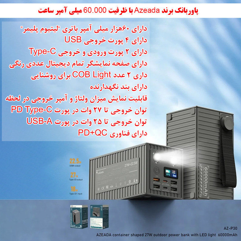 پاوربانک آزدا مدل AZ P30 ظرفیت 60000 میلی آمپر ساعت