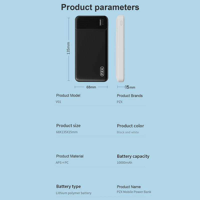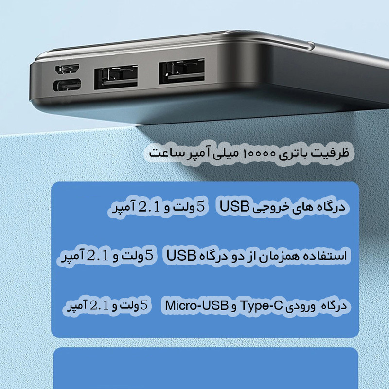 مشخصات فنی : برند معتبر pzx - ظرفیت اسمی ده هزار میلی آمپر ساعت - بسیار سبک و خوش‌دست - دارای دو درگاه USB - یک درگاه Type-C - یک درگاه Micro USB