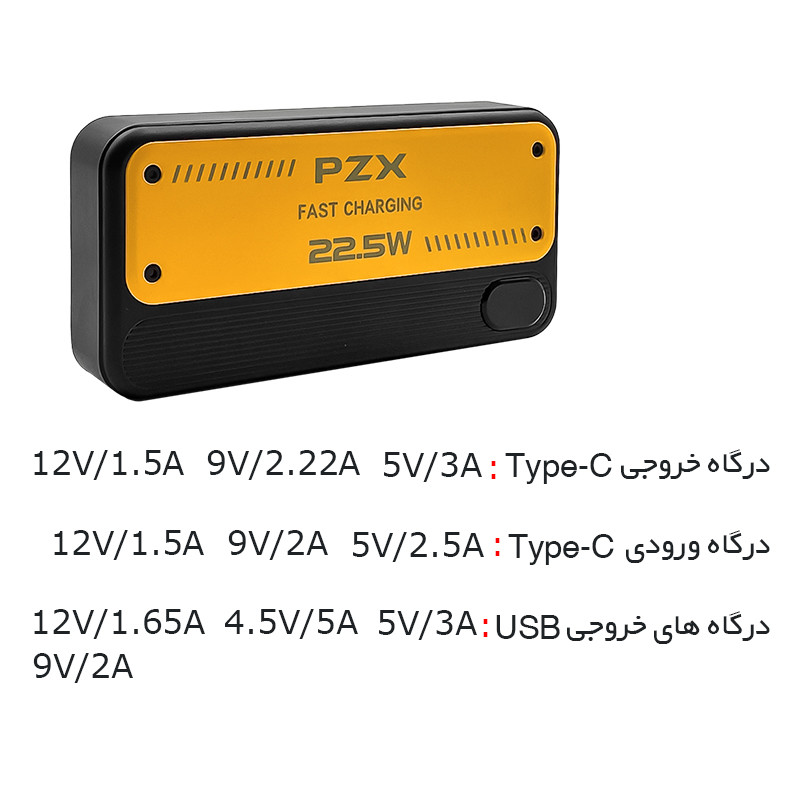 مشخصات فنی : برند معتبر PZX - ظرفیت 20 هزار میلی آمپر ساعت - قابلیت شارژ سریع - شارژ 22.5 وات - تکنولوژی شارژ PD (تنظیم هوشمند برق موردنیاز توسط پاوربانک برای دستگاه) - دارای نمایشگر میزان شارژ به درصد - دارای دو درگاه خروجی USB - یک درگاه Type C