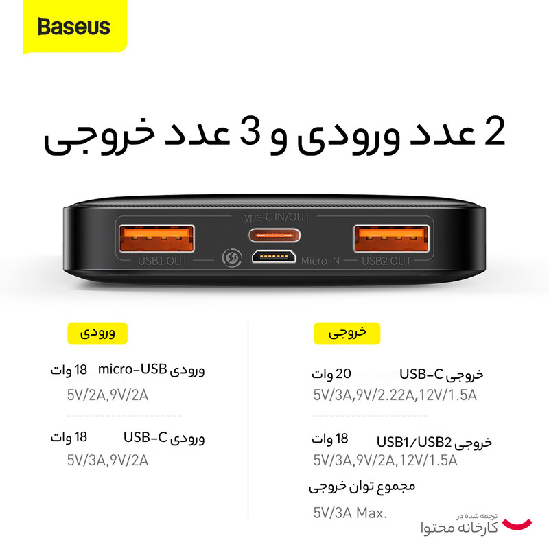 پاوربانک 10000 میلی آمپر ساعتی بیسوس دارای دو پورت ورودی نیز بوده که شامل پورتهای میکرو یو اس بی و تایپ سی میشود و باعث شده تا بتوانید به راحتی با این کابلها این پاوربانک را شارژ کنید. ولتاژ و شدت جریان ورودی هر کدام از این درگاهها متفاوت هستند و به این قرار است: حداکثر ولتاژ و شدت جریان ورودی درگاه میکرو یو اس بی: 5V~2A / 9V~2A و حداکثر ولتاژ و شدت جریان ورودی درگاه تایپ سی نیز برابر با 5V~3A / 9V~2A است.