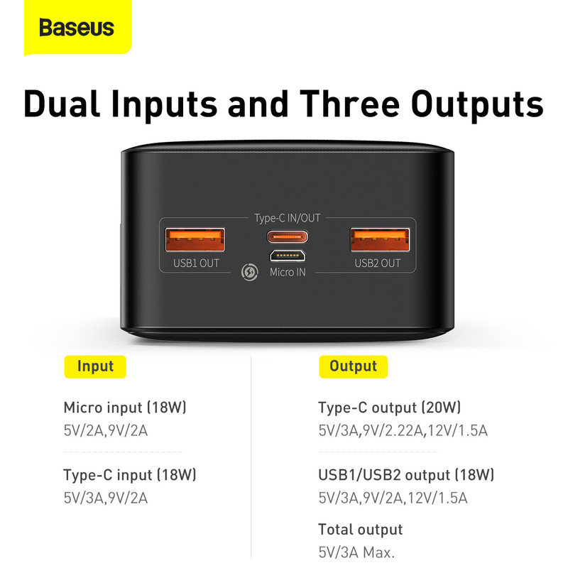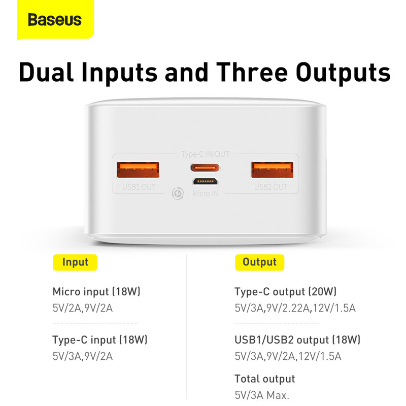 این محصول دارای سه پورت خروجی است که دوتای آن USB بوده و به شما این امکان را میدهد تا بتوانید گوشیهای خود را با ولتاژ و شدت جریان خروجی 5V~3A / 9V~2A / 12V~1.5A شارژ نمایید. همچنین این پاوربانک دارای یک پورت تایپ سی است که هم به عنوان ورودی و هم خروجی استفاده می شود. میزان خروجی پورت Type-C نیز برابر است با 5V~3A / 9V~2.22A / 12V~1.5A که میتوانید از آن بهره بگیرید. توجه داشته باشید که اگر چند دستگاه را همزمان به این پاور بانک متصل کنید، شدت خروجیهایی که گفته شد، میان آنها تقسیم میشوند. توجه داشته باشید که ولتاژ و شدت جریان خروجی کلی این پاوربانک برابر با 5V~3A است.