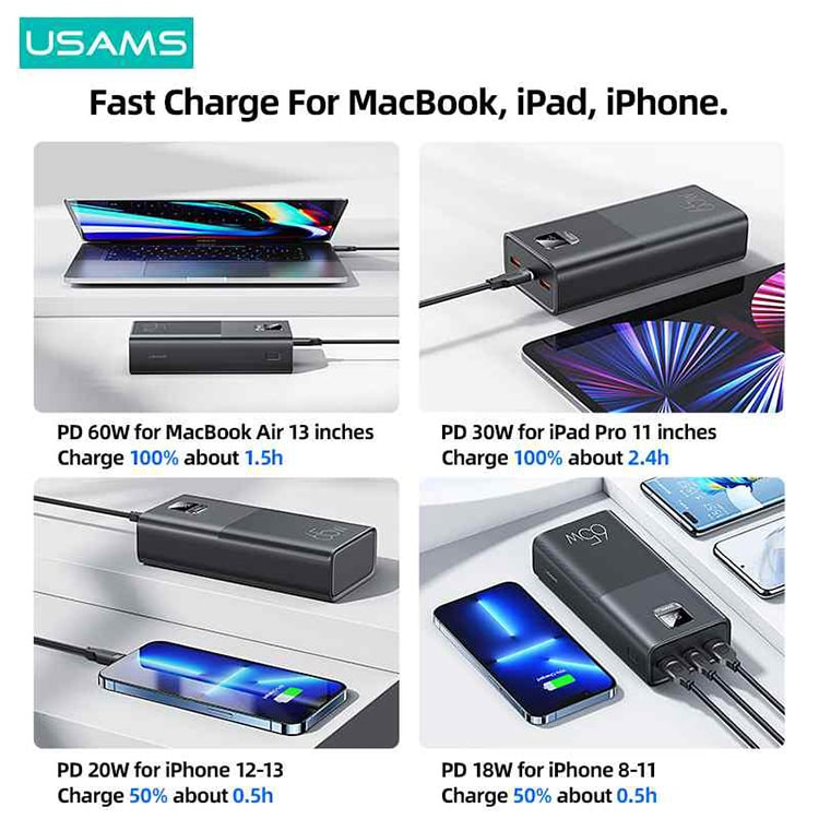 حداکثر توان خروجی های پاوربانک 30 هزار یوسامز 65 وات است که از استانداردهای فست شارژ و فناوری PD و QC بهره میبرند و میتوانند انواع لپ تاپ و نوت بوک و همچنین انواع تلفن همراه را با سرعت بالا شارژ کند.