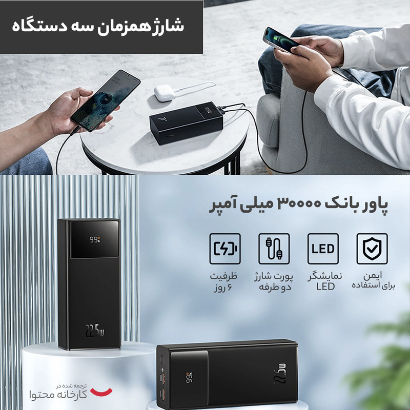 مشخصات فنی : 3 پورت خروجی شامل 2 پورت USB و یک پورت تایپ سی - ظرفیت اسمی 30000 میلی آمپر ساعت - توان خروجی 22.5 وات - وزن 648 گرم - علاوهبر قابلیت شارژ همزمان 3 وسیلهی الکترونیکی - پشتیبانی از پروتکل های SCP و FCP هوآوی، PD اپل، QC شیائومی و AFC سامسونگ