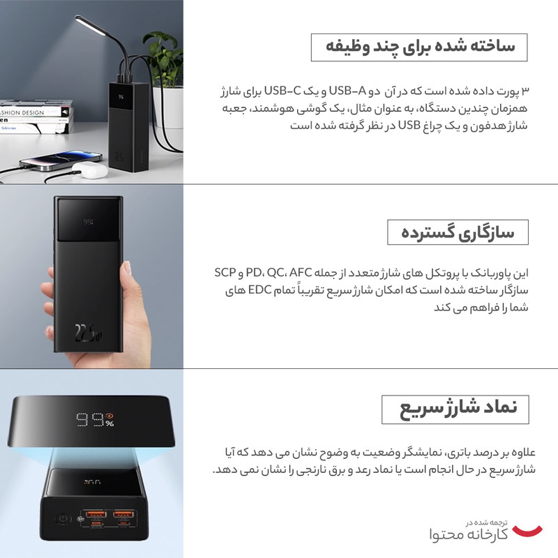 این پاوربانک بیسوس با ظرفیت بالای خود، همراه خوبی هنگام سفر و جابجایی های طولانی است که دارای توان خروجی 22.5 وات نیز می باشد که قادر است گوشی موبایل را با سرعت قابل قبولی شارژ نماید.علاوهبر قابلیت شارژ همزمان 3 وسیلهی الکترونیکی، پاوربانک بیسوس به پروتکلهای فستشارژ گوناگونی نیز مجهز است که با برندهای مختلف هماهنگی دارند. ازجملهی این پروتکلها میتوان به SCP و FCP هوآوی، PD اپل، QC شیائومی و AFC سامسونگ اشاره کرد.