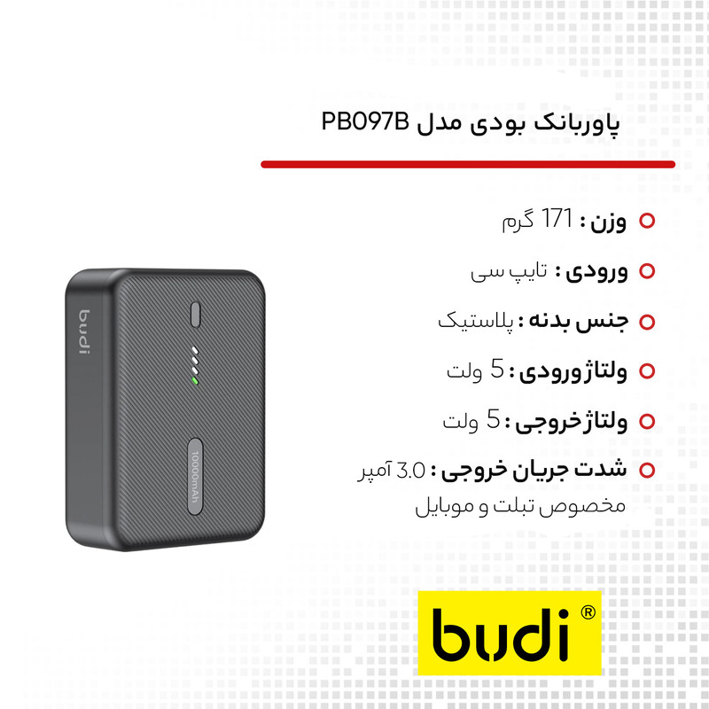 پاور بانک PB097B از برند بودی ، یکی از معتبر ترین برند های جهانی در عرصه لوازم جانبی دیجیتال می باشد . این پاوربانک به لطف فناوری شارژ سریع دوگانه PD 20W و QC3.0، شارژ سریع دستگاه های مختلف از جمله گوشی های هوشمند، تبلت ها و موارد دیگر را تضمین می کند و با ظرفیت 10000 میلی آمپر ساعتی، پاوربانک بودی بیش از اندازه کافی قدرت دارد تا گجت های شما را چندین بار شارژ کند . Budi اولویت بالایی برای ایمنی قائل است و ویژگیهای ایمنی داخلی را برای دفاع در برابر اتصال کوتاه، شارژ بیش از حد و گرمای بیش از حد در نظر میگیرد، بنابراین هم پاوربانک و هم وسایل شما برای مدت طولانی دوام میآورند . این پاوربانک ، سبک وزن و مناسب سفر است، بنابراین میتوانید هر جا که میروید بدون از دست دادن راحتی، شارژ داشته باشید . این پاوربانک به دلیل پشتیبانی از PD 20W و QC3.0 Quick Charge که امکان شارژ موثر و سریع همه دستگاه ها را فراهم می کند، می تواند با طیف گسترده ای از دستگاه ها استفاده شود . پاور بانک بودی ایمنی را با مکانیسمهای محافظ داخلی برای محافظت در برابر شارژ بیش از حد، گرمای بیش از حد و اتصال کوتاه اولویت میدهد و از طول عمر دستگاههای شما و خود پاوربانک اطمینان میدهد . با نمایشگر دیجیتال LED قدرت، وضعیت کار را در یک نگاه مشاهده کنید . بودی(Budi) از تولید کنندگان محصولات جانبی دیجیتال در سراسر جهان می باشد . با توجه به افزایش روز افزون افراد به کالاهای دیجیتال ، این برند گامی مؤثر در عرضه این مدل محصولات برداشته و با کیفیت هر چه تمام تر در جهت رشد و توسعه برنامه های خود برای تولید لوازم جانبی دیجیتال حرکت می کند .