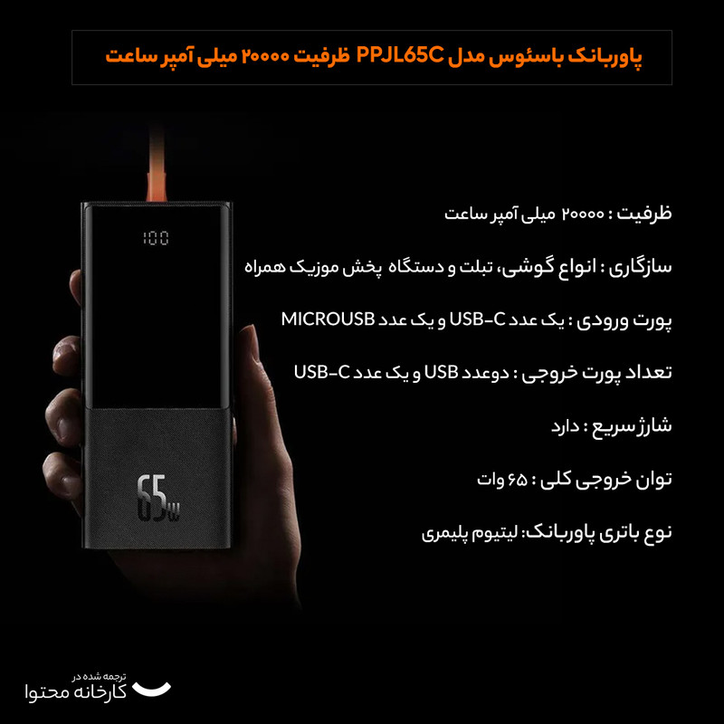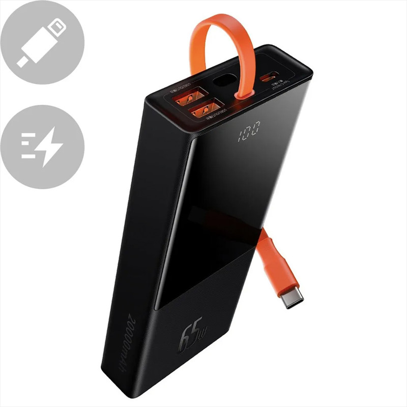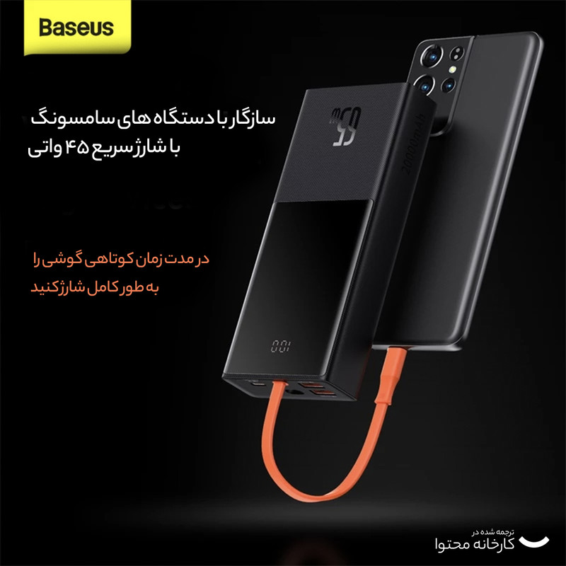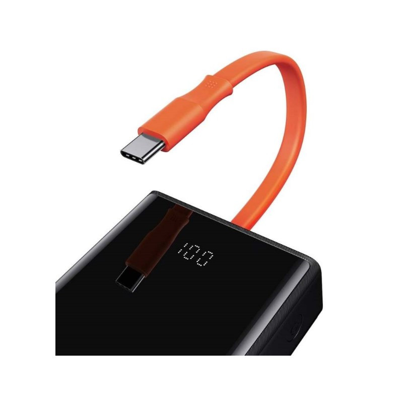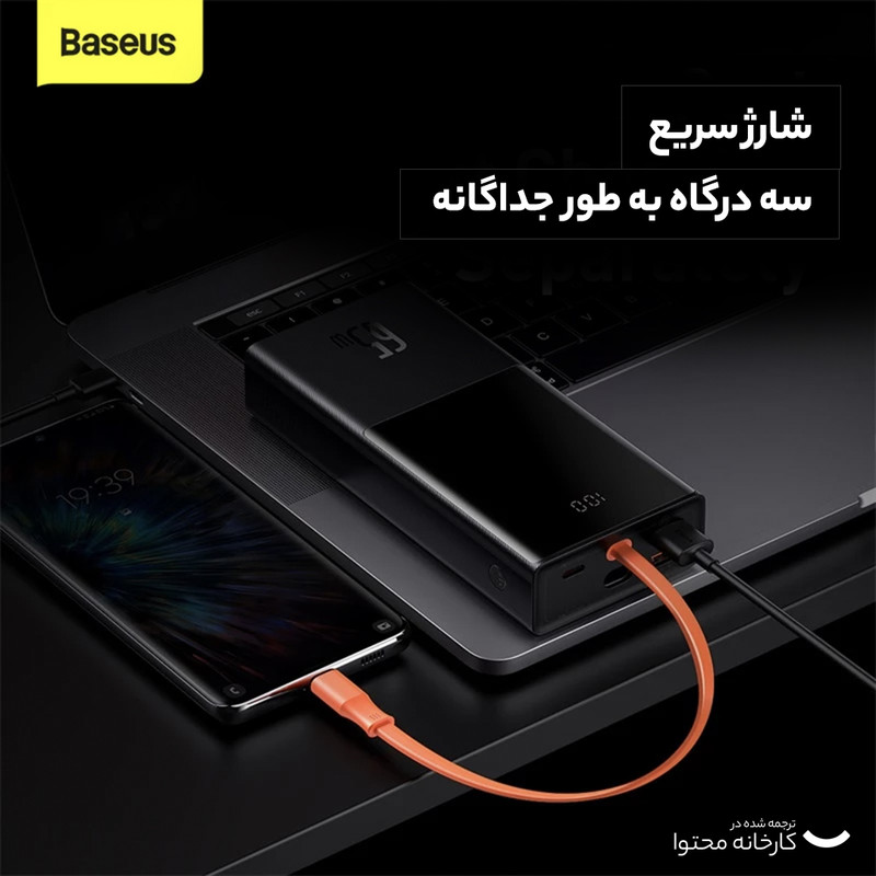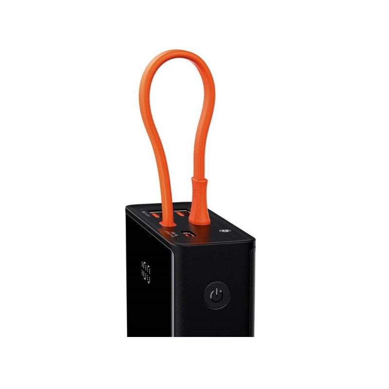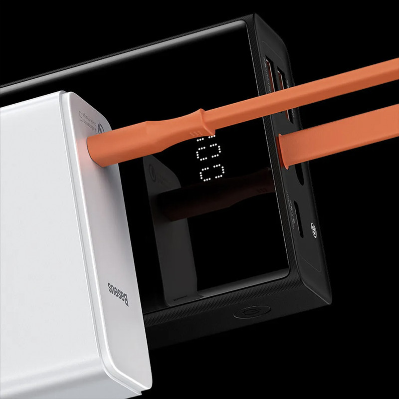 همانطور که گفتیم یک کابل نارنجی رنگ به پاوربانک 20000 باسئوس Elf متصل است که از نوع Type-C میباشد. قابلیت مهم این کابل این است که علاوه بر شارژ کردن خود پاوربانک (ورودی)، میتواند گوشی شما را هم شارژ کند (خروجی). شارژپاوربانک با یک آداپتور مناسب تنها 90 دقیقه طول میکشد.